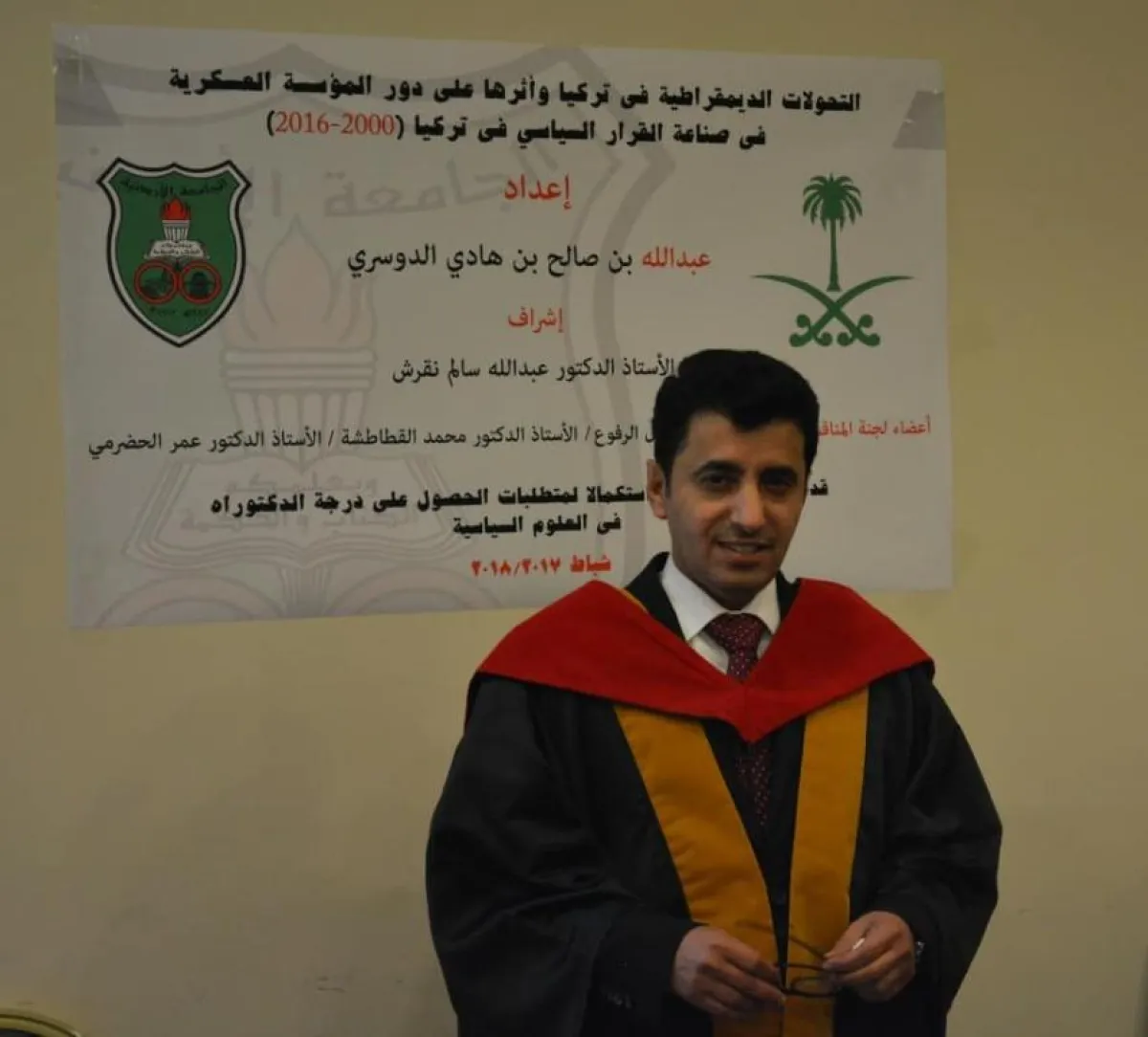 وأدار المناقشة في أطروحة الدوسري، الأستاذ الدكتور عبد الله نقرش، بصفته رئيساً ومشرفاً على الباحث، وبعضوية كل من الأستاذ الدكتور فيصل الرفوع، والأستاذ الدكتور محمد القطاطشة، والأستاذ الدكتور عمر الحضرمي، وفي ختام المناقشة تم منح الباحث درجة الدكتوراه في العلوم السياسية بشكل رسمي، لتكون أول شهادة في الدكتوراه بهذا التخصص من الجامعة الأردنية، من نصيب المملكة العربية السعودية، عبر الباحث السعودي عبد الله بن صالح الدوسري.