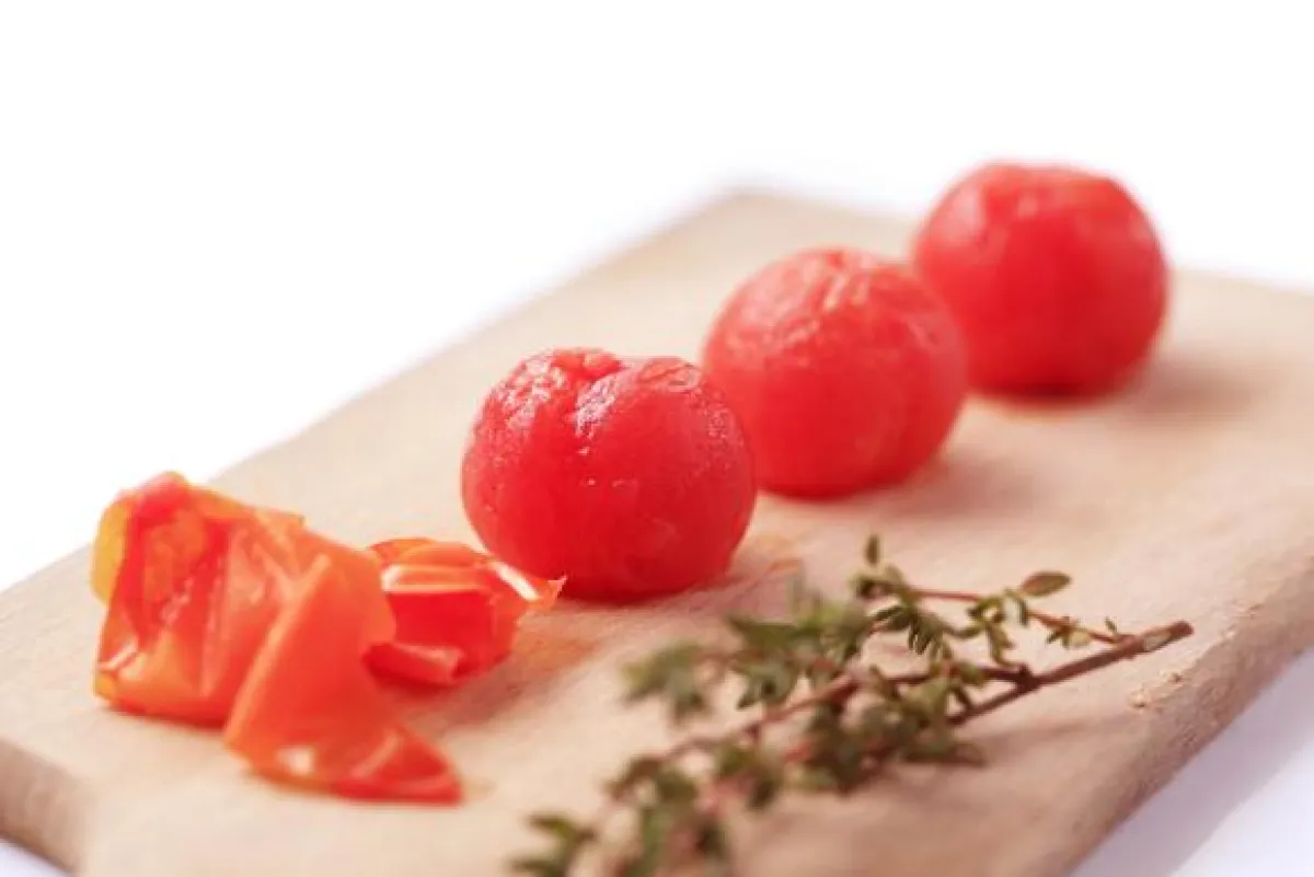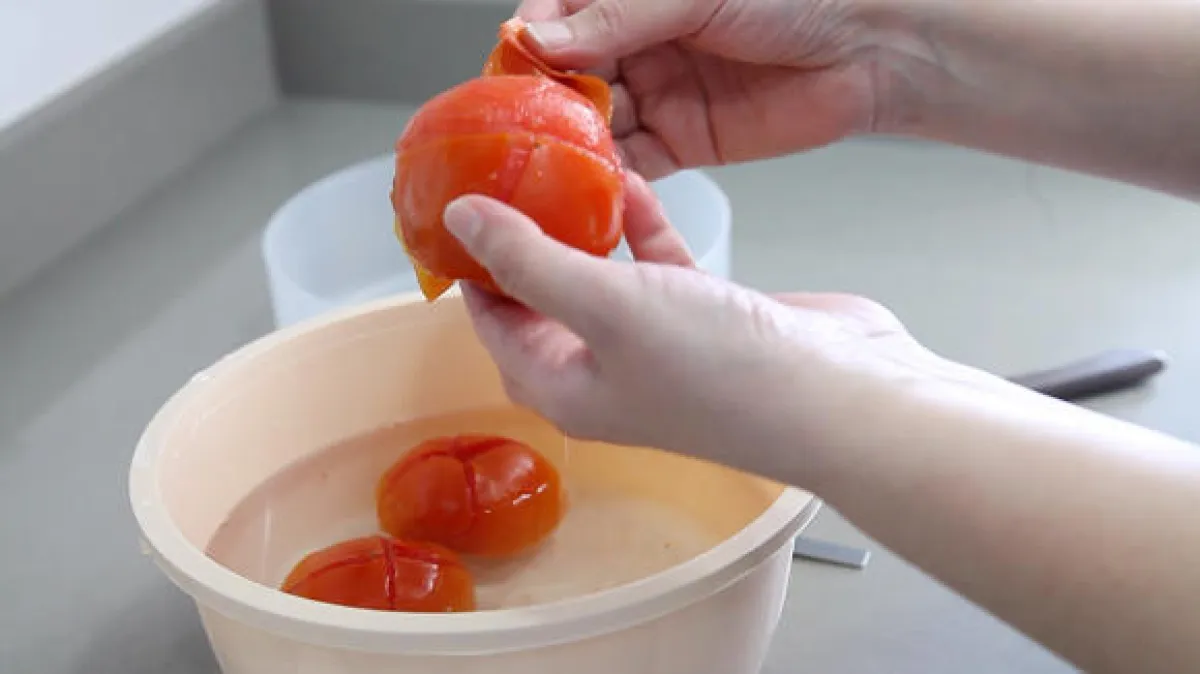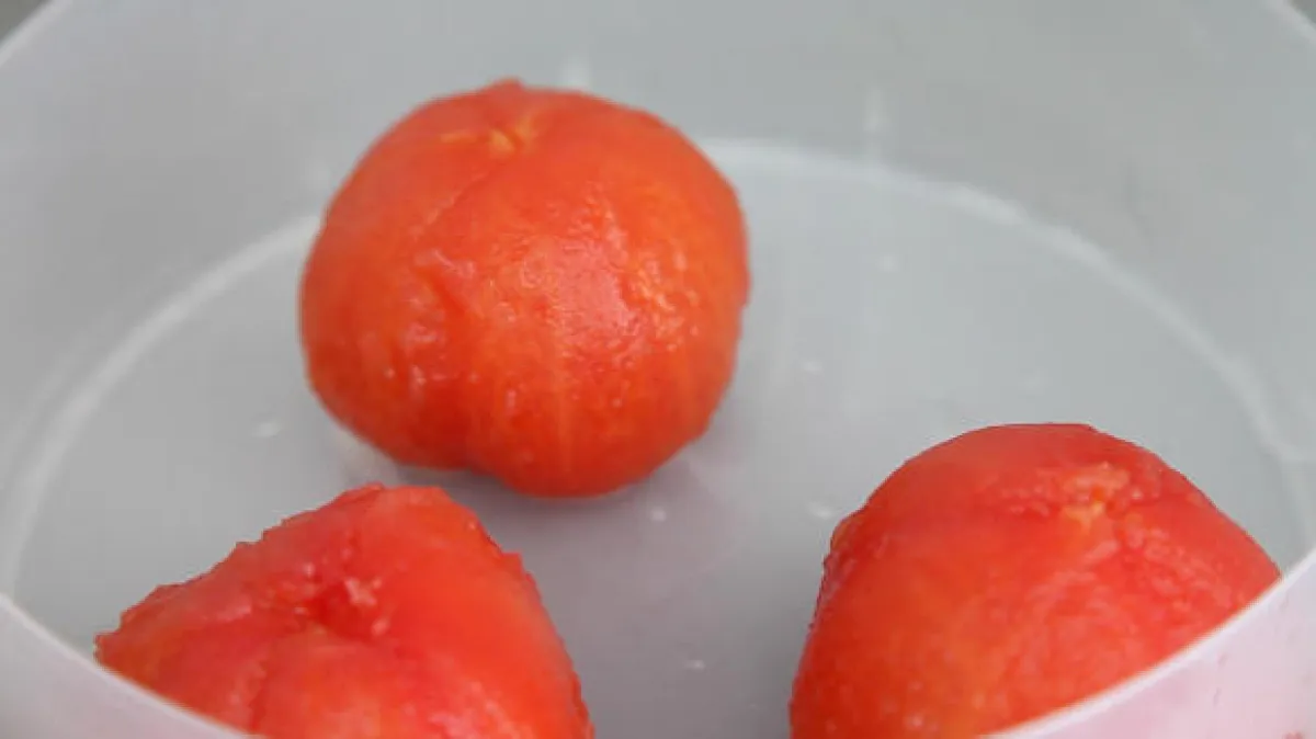 5 ـ ارفعي حبّات الطماطم من الماء والثلج، وقشّريها بكلّ سهولة.