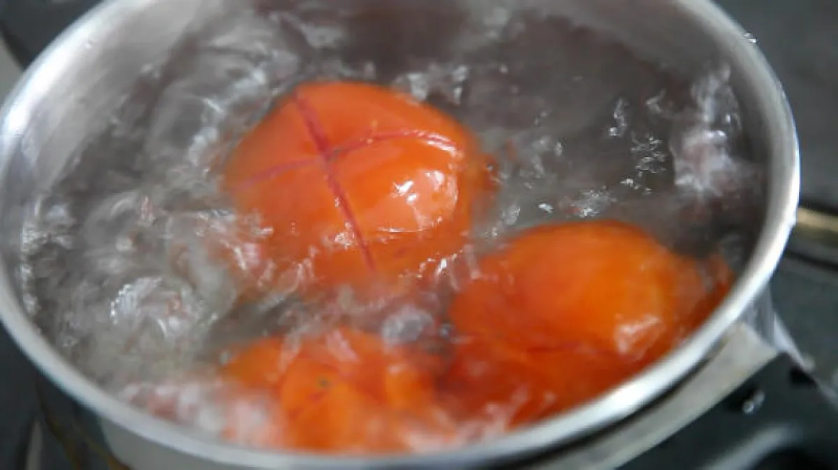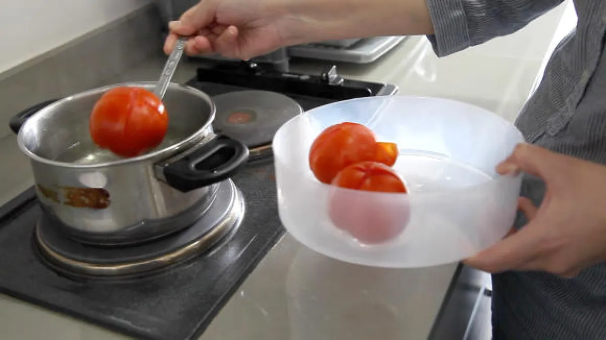 3 ـ ضعي حبّات الطماطم داخل الماء المغلي، لمدّة تتراوح بين دقيقة ودقيقتين.