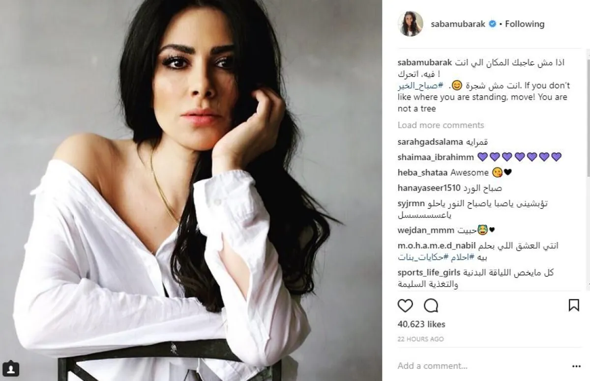 الفنانة الأردنية صبا مبارك واصلت نشر النصائح المحرضة على التغيير في الحياة الشخصية، وعدم الاستسلام لظروف الواقع بخاصة في ما يتعلق بالعلاقات بين الأفراد، ونشرت عبر حسابها بموقع انستقرام صورة لها وعلّقت عليها قائلة: إذا مش عاجبك المكان اللي أنت فيه اتحرك أنت مش شجرة.. صباح الخير.