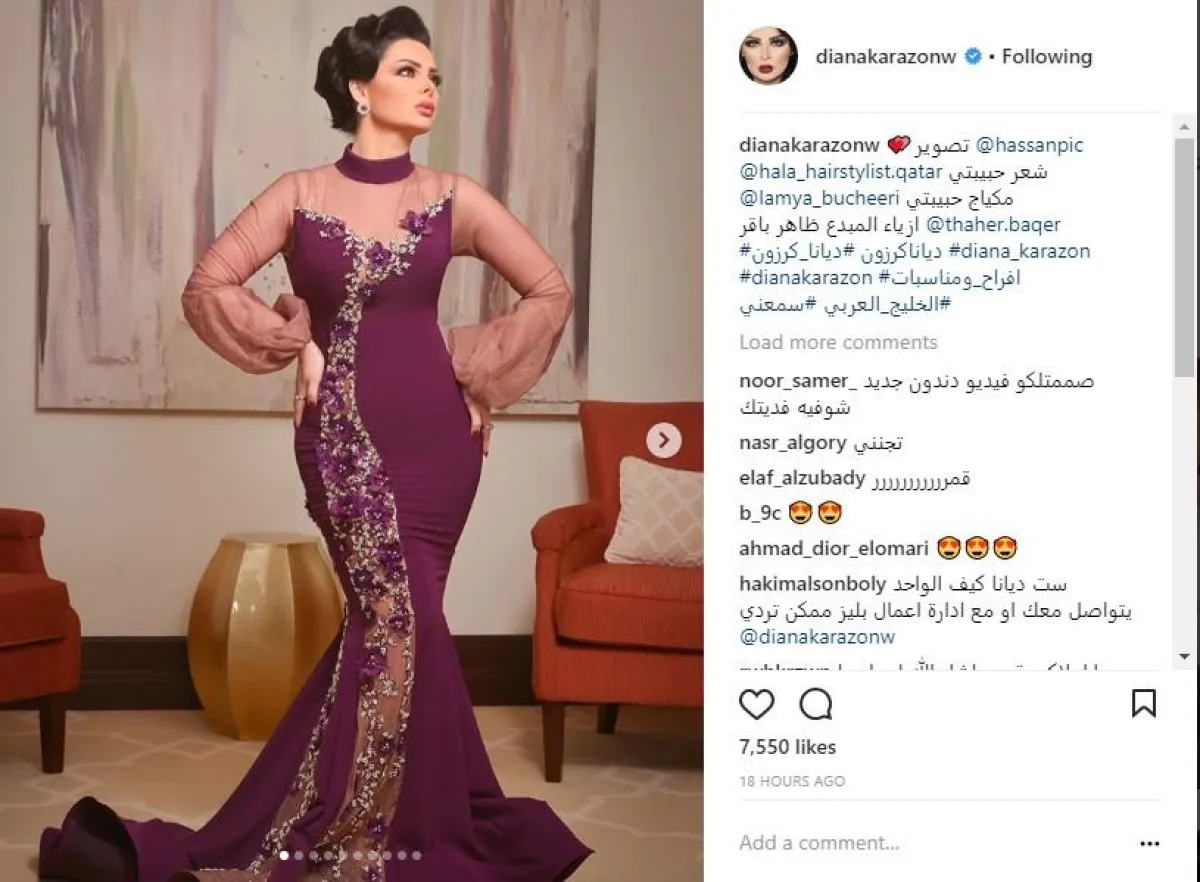 الفنانة الأردنية ديانا كرزون شاركت جمهورها عبر حسابها بموقع انستقرام، حصاد أحدث جلسة تصوير خضعت لها على هامش إحياء إحدى حفلات الزفاف، حيث تمسكت برشاقتها، كما أضافت أناقة الأميرات بحسب تعليقات جمهورها.