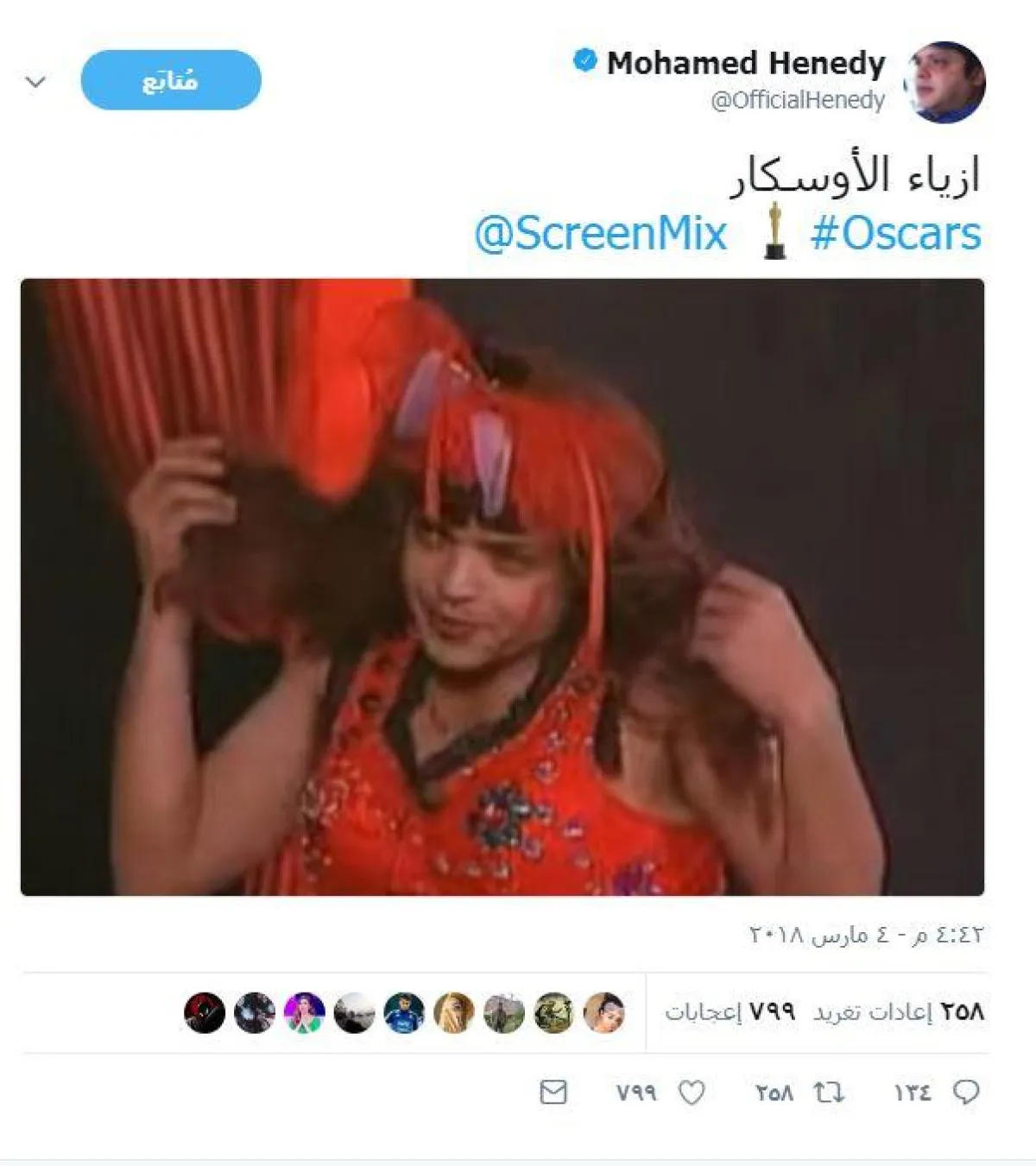 في كل الأحداث الفنية والرياضية بات رواد موقع تويتر على موعد مع الفنان الكوميدي محمد هنيدي، الذي لا يفوّت مناسبة إلّا ويطلق تغريدة ساخرة، وقد فعلها بالأمس عندما علّق على مرور جميلات الأوسكار على السجادة الحمراء، ونشر صورة ساخرة له من كواليس مسرحية "حزّمني يا" وهو يرتدي بدلة رقصة وعلّق عليها قائلًا: "أزياء الأوسكار".