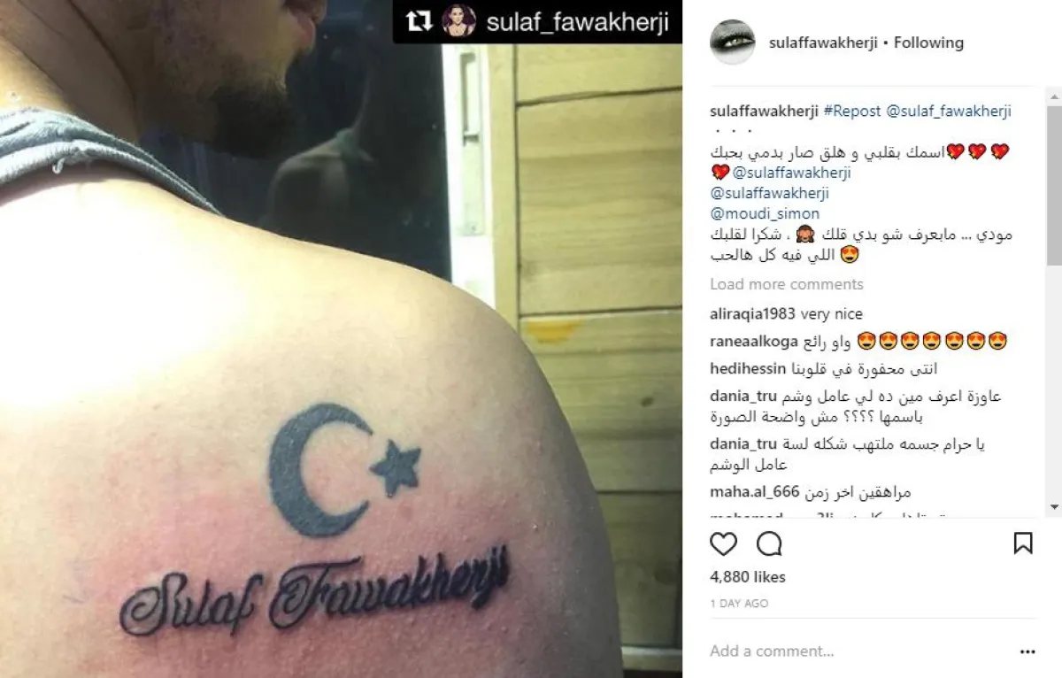 وعلّق المعجب ويدعى مودي على "الوشم"، قائلًا: اسمِك بقلبي وهلق صار بدمّي بحبّك، وقدّمت سلاف فواخرجي الشكر له على هذه الصورة قائلة: مودي ... ما بعرف شو بدي قلّك، شكرًا لقلبك اللي فيه كل هالحب.