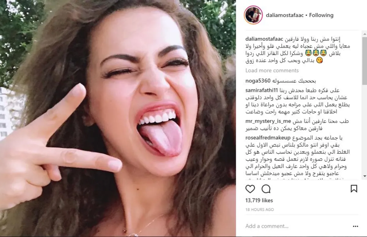 الفنانة داليا مصطفى انضمت لقائمة النجمات الغاضبات من تدخل الجمهور في حياتهنّ الشخصية، ونشرت صورة لها وهي تُخرج لسانها للجميع، مع رسالة غاضبة لمنتقدي نشر صورتها بملابس السباحة، قالت فيها: إنتوا مش ربّنا، ولا فارقين معايا واللي مش عجباه ليه يعملّي فولو، وأخيرًا ولا بلاش.. شكرًا لكل الفانز اللي ردوا بدالي وبحب كل واحد عنده ذوق.