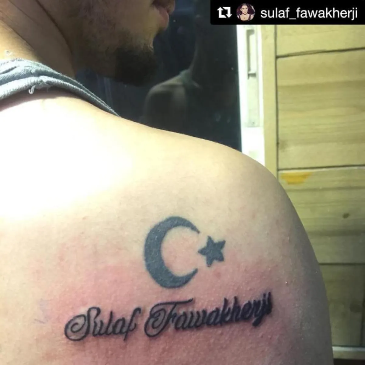 الممثلة السورية سلاف فواخرجي، أعادت نشر صورة لأحد معجبيها يدّعي الجنون بها، ورسم وشمًا على كتفه تعبيرًا منه عن حبّه الشديد لها.