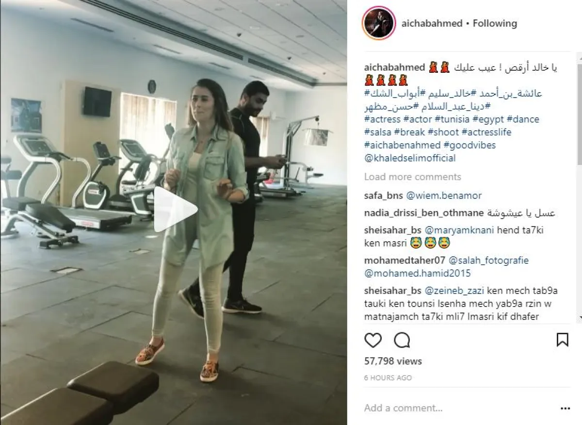 الفنانة التونسية عائشة بن أحمد نشرت مقطعًا مصورًا عبر حسابها بموقع انستقرام، برفقة زميلها المطرب خالد سليم، وهي تمارس تمارين الرقص، وتحاول دعوته لمجاراتها في حركاتها السريعة، معلّقة بقولها: يا خالد أرقص عيب عليك، ولكنه اكتفى بالمتابعة، وبدا واضحًا أنّ المقطع تم تصويره ضمن كواليس مسلسلهما "أبواب الشك".