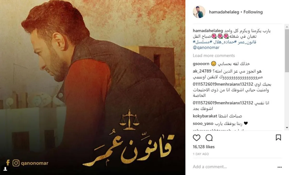 الفنان حمادة هلال نشر أول بوستر دعائي لمسلسله الجديد "قانون عمر" المنتظر عرضه ضمن ماراثون دراما رمضان 2018، وظهر "حمادة فيه" بنظرة حزن، تعبّر عن حالة الشخصية التي يجسدها في الأحداث، وعلّق حمادة قائلًا: يا رب يكرمنا ويكرم كل واحد تعبان في شغله صباح الفل.