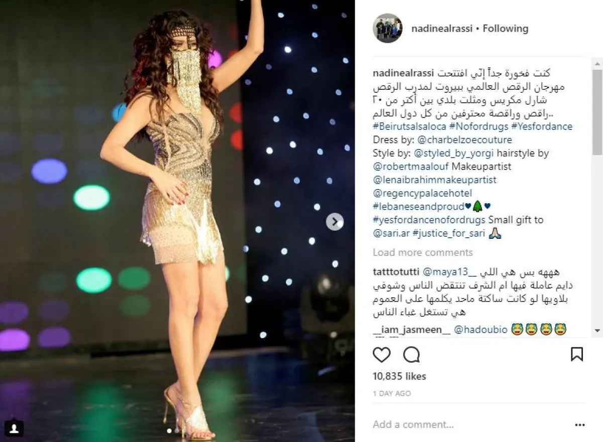 الممثلة اللبنانية نادين الراسي، ردت على الضجة المثارة حول رقصها في حفل مكافحة المخدرات، بنشر صورة لها من الحفل اثناء تقديم رقصتها وعلقت عليها قائلة: كنت فخورة جدًّا إنّي افتتحت مهرجان الرقص العالمي ببيروت لمدرب الرقص شارل مكريس، ومثلت بلدي بين أكتر من ٢٠ راقصًا وراقصة محترفين من كل دول العالم.