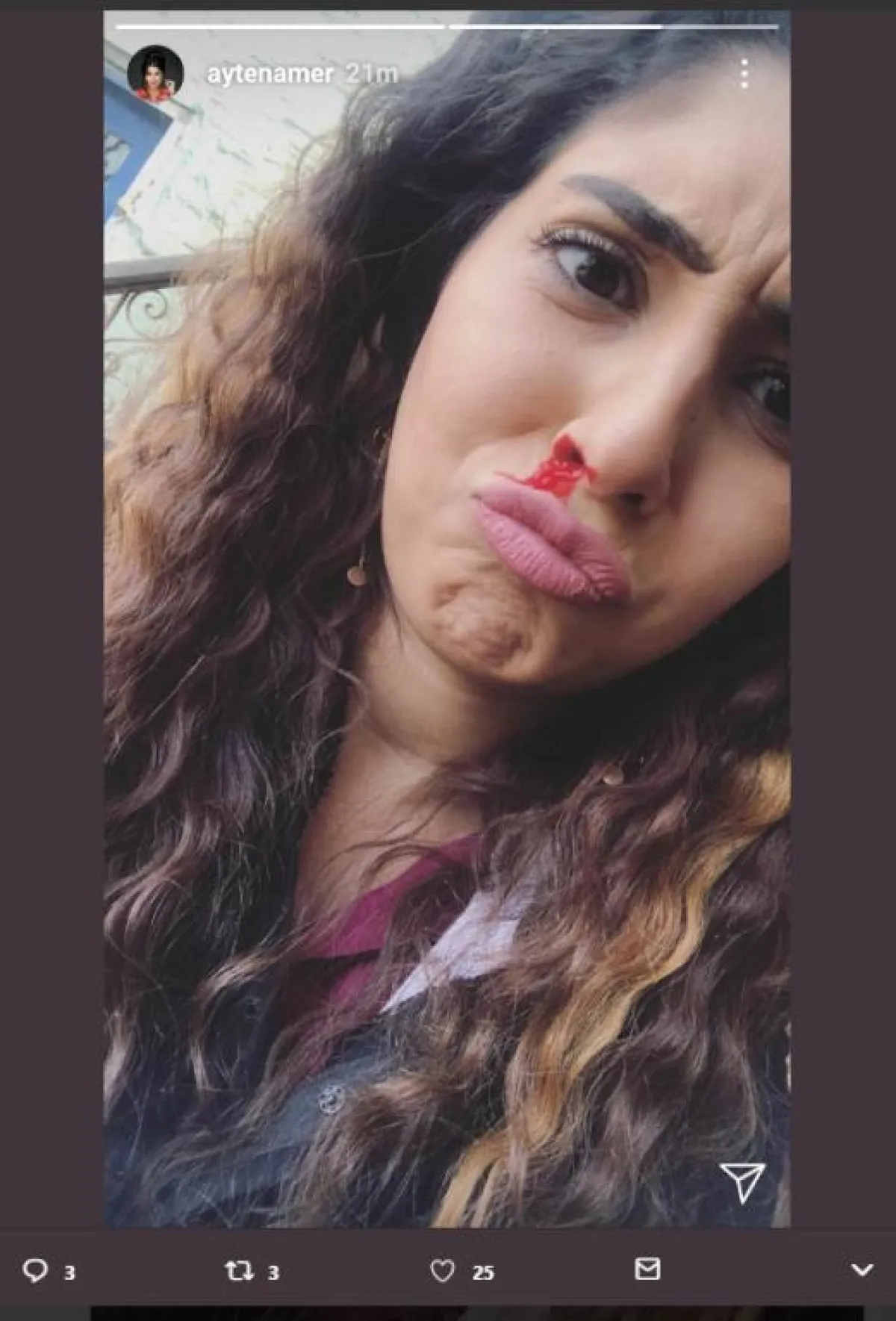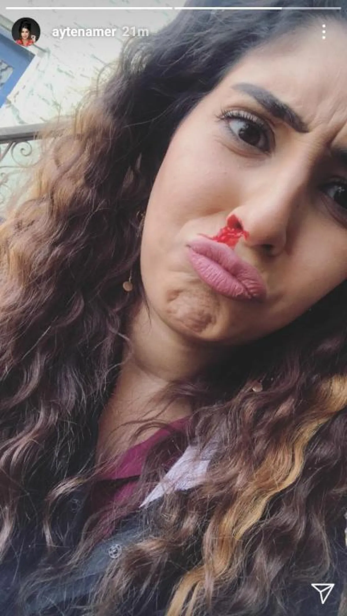 الفنانة أيتن عامر نشرت عبر حسابها بموقع انستقرام، صورة لها من كواليس مسلسل "أيوب" المقرر عرضه في ماراثون دراما رمضان 2018، حيث ظهرت وهي مصابة، وتنزف الدماء من أنفها، وتبيّن في ما بعد، أنّ الدماء حيلة فنية يتم استخدامها للتصوير.