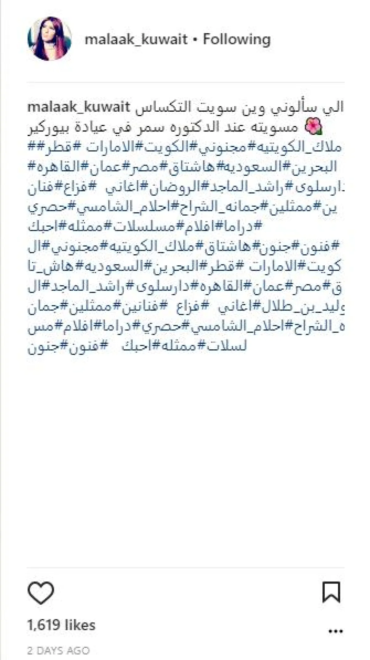 ملاك الكويتية شاركت جمهورها لحظة بلحظة، التغيّرات التي طرأت على شكلها بعدما خضعت لجراحة متخصصة في نحت عظام الوجه، قالت إنها تدعى "تكساس" ولم تفوّت فرصة الدعاية للطبيبة التى أجرت لها الجراحة.