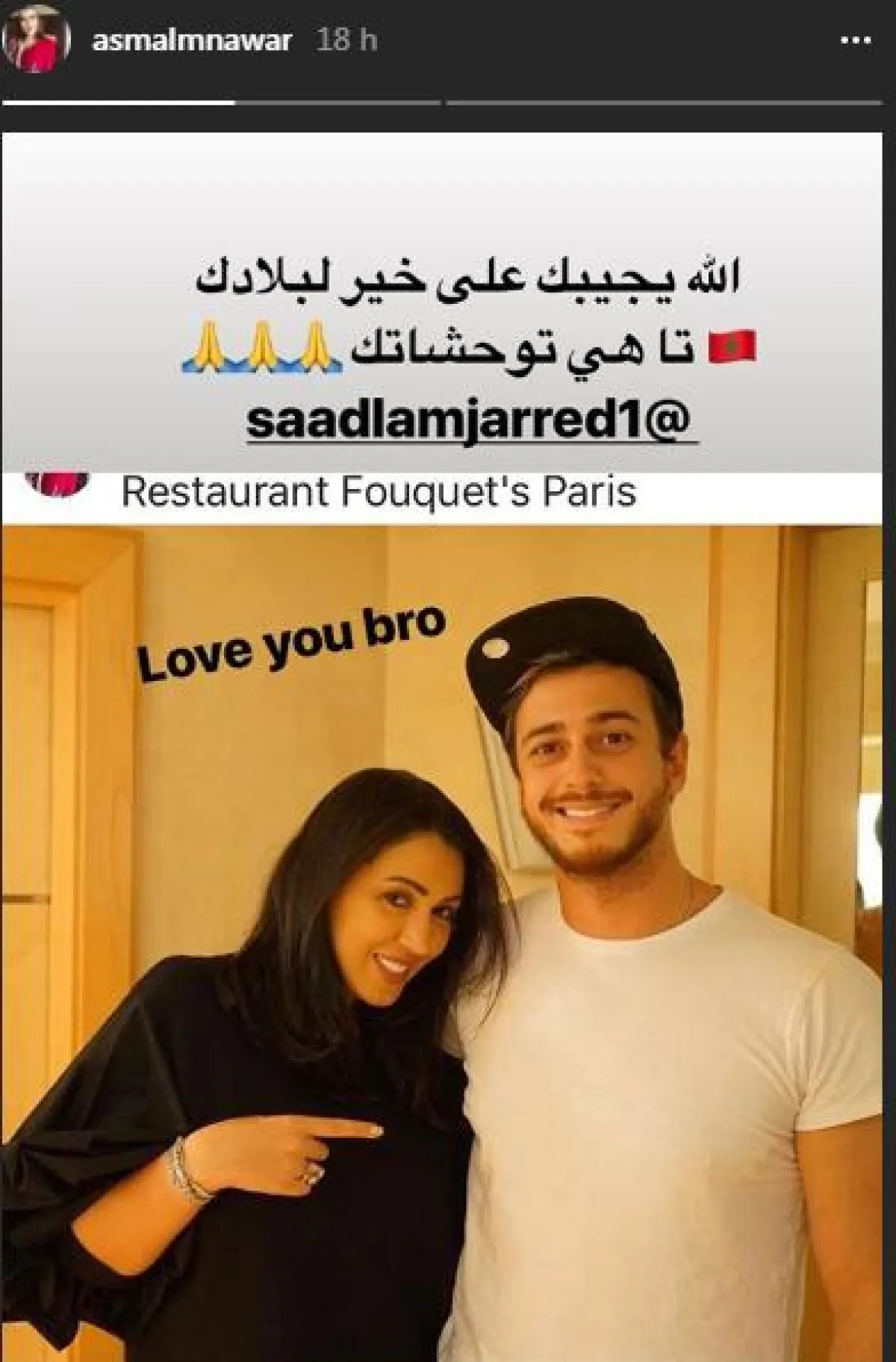 الفنانة المغربية أسماء المنور نشرت صورة تجمعها بزميلها الفنان سعد المجرد، وذلك عبر حسابها على موقع انستقرام، عقب إعلانه خبر عودته إلى المغرب بشكل موقت، وعلّقت على الصورة قائلة :"الله يجيبك على خير لبلادك حتى هي توحشاتك".
