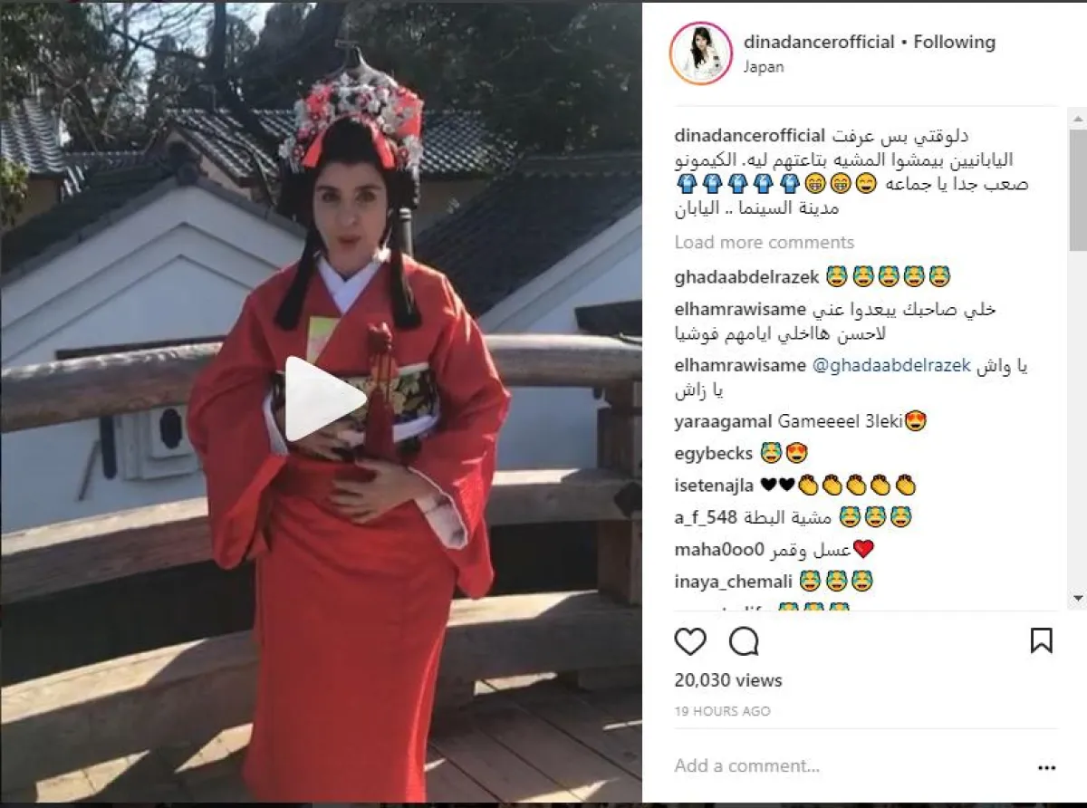الفنانة الاستعراضية دينا الموجودة حاليًّا في اليابان، شاركت جمهورها على موقع انستقرام فيديو ، أثناء محاولتها المشي وهي ترتدي الزي الياباني الشهير "الكيمونو"، وعلقت دينا على الفيديو قائلة: "دلوقتِ بس عرفت اليابانيين بيمشوا المشية بتاعتهم ليه، الكيمونو صعب جدًّا يا جماعة"، كما علقت خلال الفيديو قائلة: "لو تعرفوا اللبس ده بيخنق إزاي مش هتصدقوا، فيه أكتر من 30 ربطة على البطن".