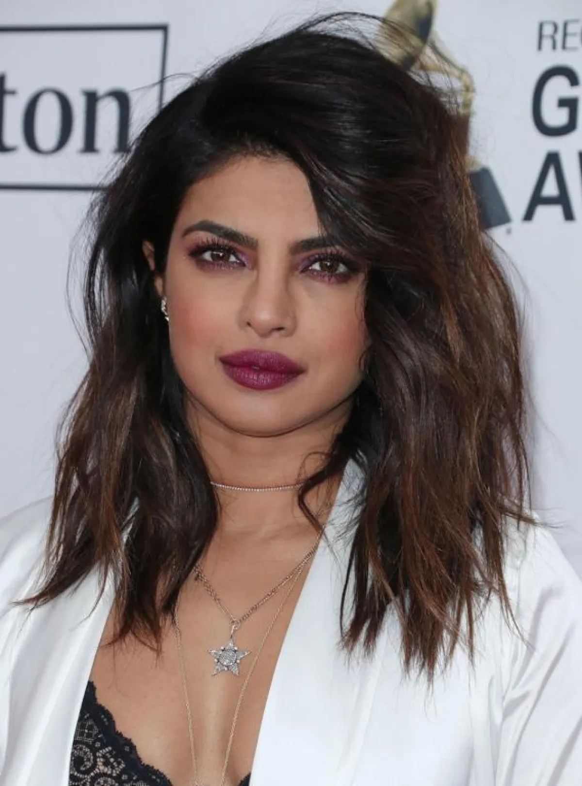 أما مكياج بريانكا صاحبة البشرة السمراء والشفاه الكبيرة، فيرتكز على العدسات اللاصقة باللون الأخضر، وكريم الأساس باللون البرونزي، إلى جانب ظلال العينين الأسود وأحمر الشفاه الباهت اللون، لتُبرز جمال شفتيها الطبيعي.
