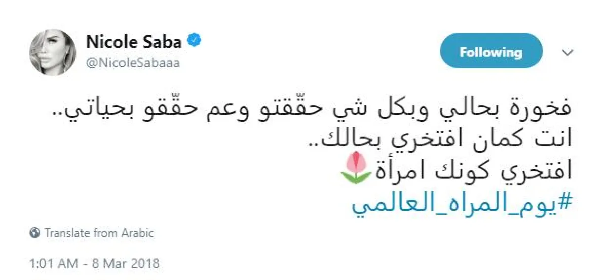 وقالت الفنانة اللبنانية نيكول سابا: فخورة بحالي وبكل شي حقّقتو وعم حقّقو بحياتي..انت كمان افتخري بحالك.. افتخري كونك امرأة.