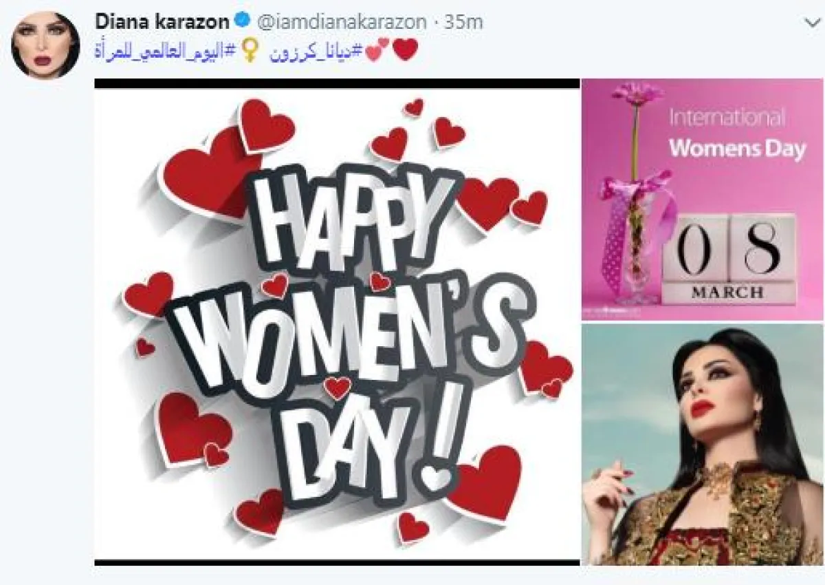 المطربة الأردنية ديانا كرزون شاركت تغريدة لها ، ظهرت فيها صورة لمعايدة المرأة في يومها العالمي.