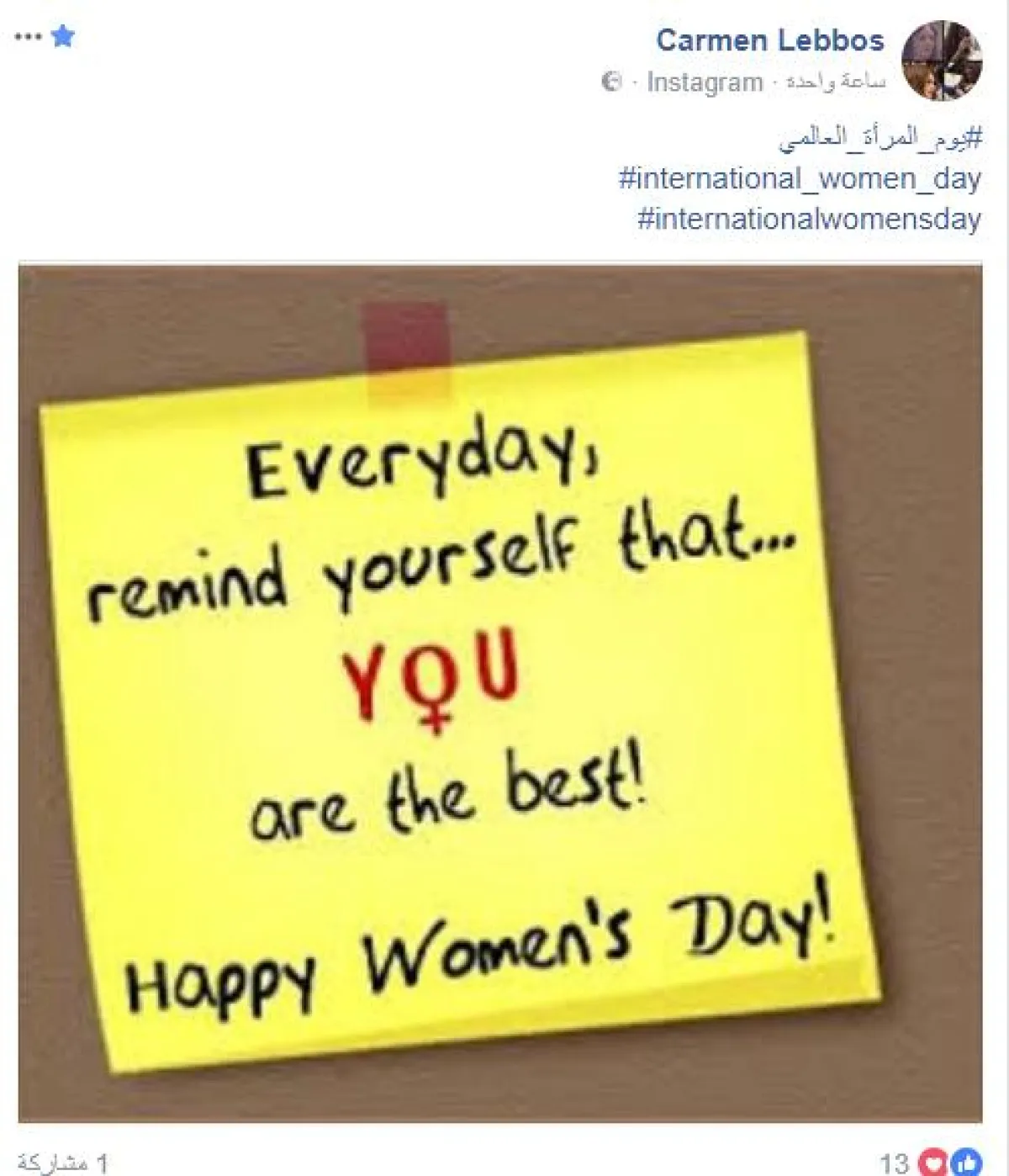 الممثلة اللبنانية كارمن لبس كانت أول من افتتح الاحتفال بيوم المرأة العالمي عبر حسابها بموقع الفيس بوك وقالت: : كل يوم ذكري نفسك أنك الأفضل يوم مرأة سعيد.