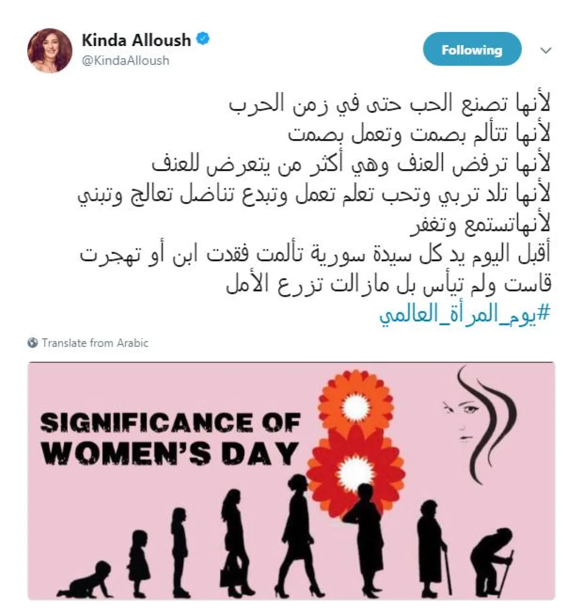 أضافت: أقبل اليوم يد كل سيدة سورية تألمت فقدت ابن أو تهجرت قاست ولم تيأس بل ما زالت تزرع الأمل #يوم_المرأة_العالمي".
