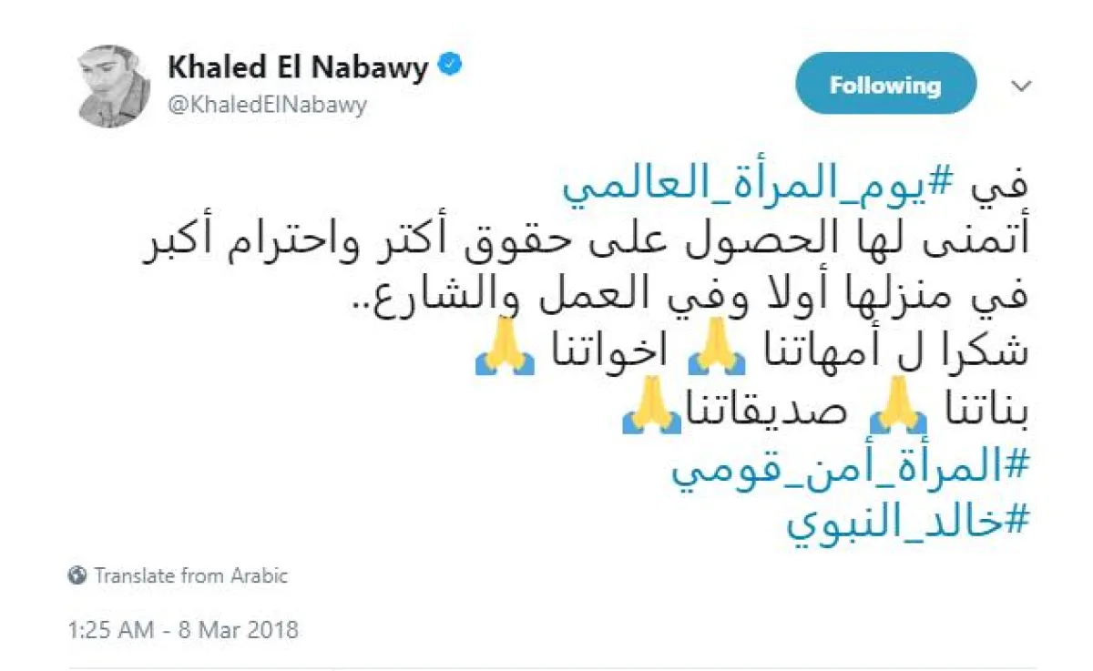 وشاركه النجم المصري خالد النبوي الاحتفال بتغريدة قائلا: في #يوم_المرأة_العالمي أتمنى لها الحصول على حقوق أكتر واحترام أكبر في منزلها أولا وفي العمل والشارع.. شكرا ل أمهاتنا اخواتنا بناتنا صديقاتنا وأطلق هاشتاق جديد بعنوان #المرأة_أمن_قومي.