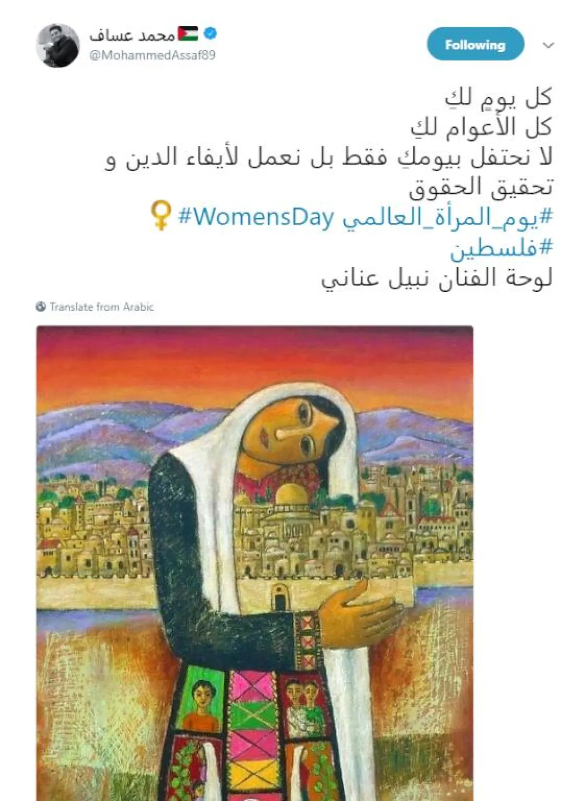 المطرب الفلسطينى محمد عساف نشر لوحة للمرأة الفلسطينية بريشة الفنان نبيل عناني، وغرد قائلا: كل يومٍ لكِ، كل الأعوام لكِ لا نحتفل بيومكِ فقط بل نعمل لأيفاء الدين و تحقيق الحقوق #يوم_المرأة_العالمي #WomensDay #فلسطين.