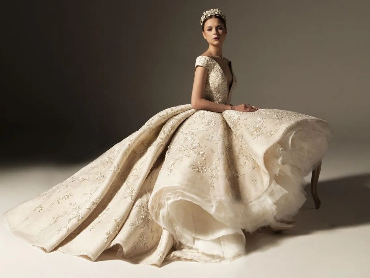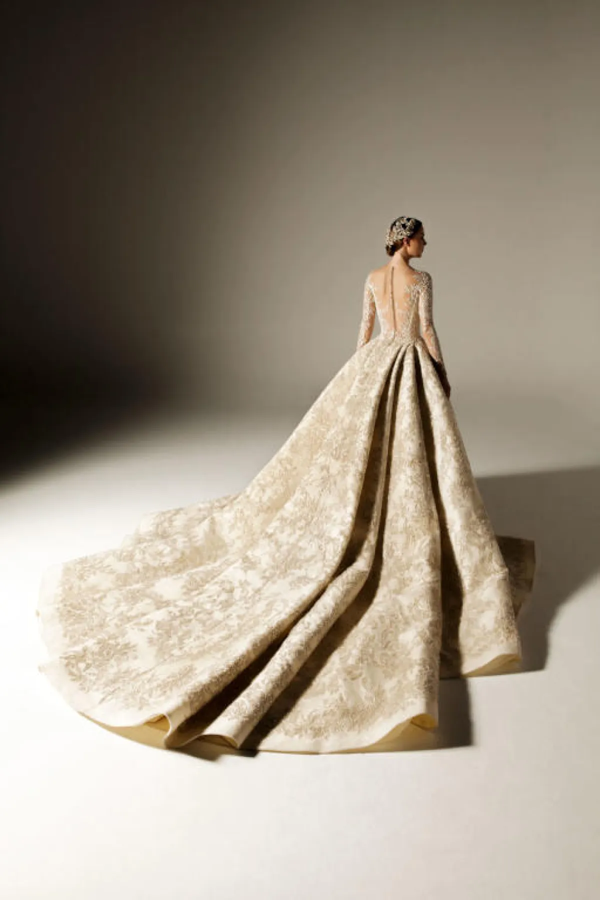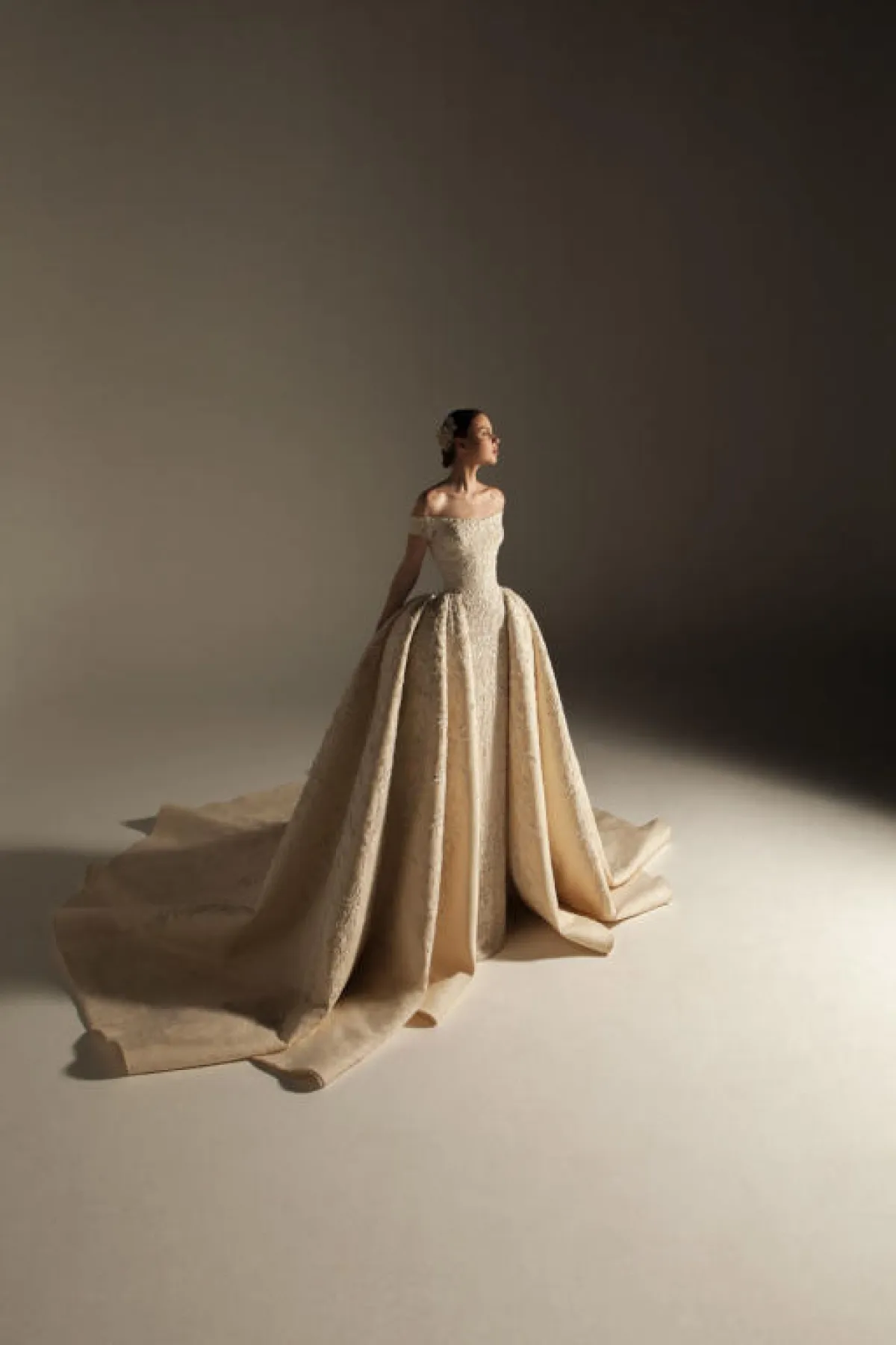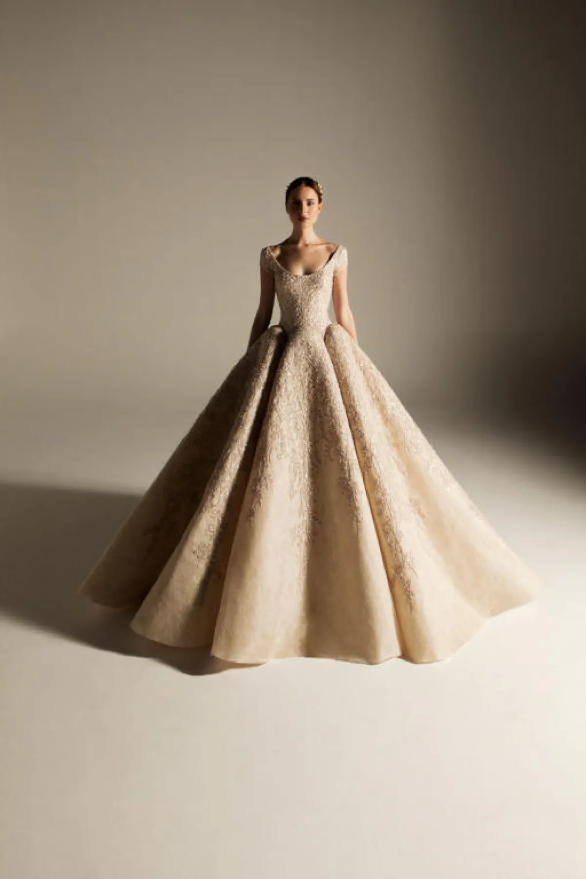 تكونت فساتين زفاف عروس 2018 من تصميم كريكور جابوتيان من 5 تصاميم عصرية، بدرجات اللونين الذهبي والبيج.