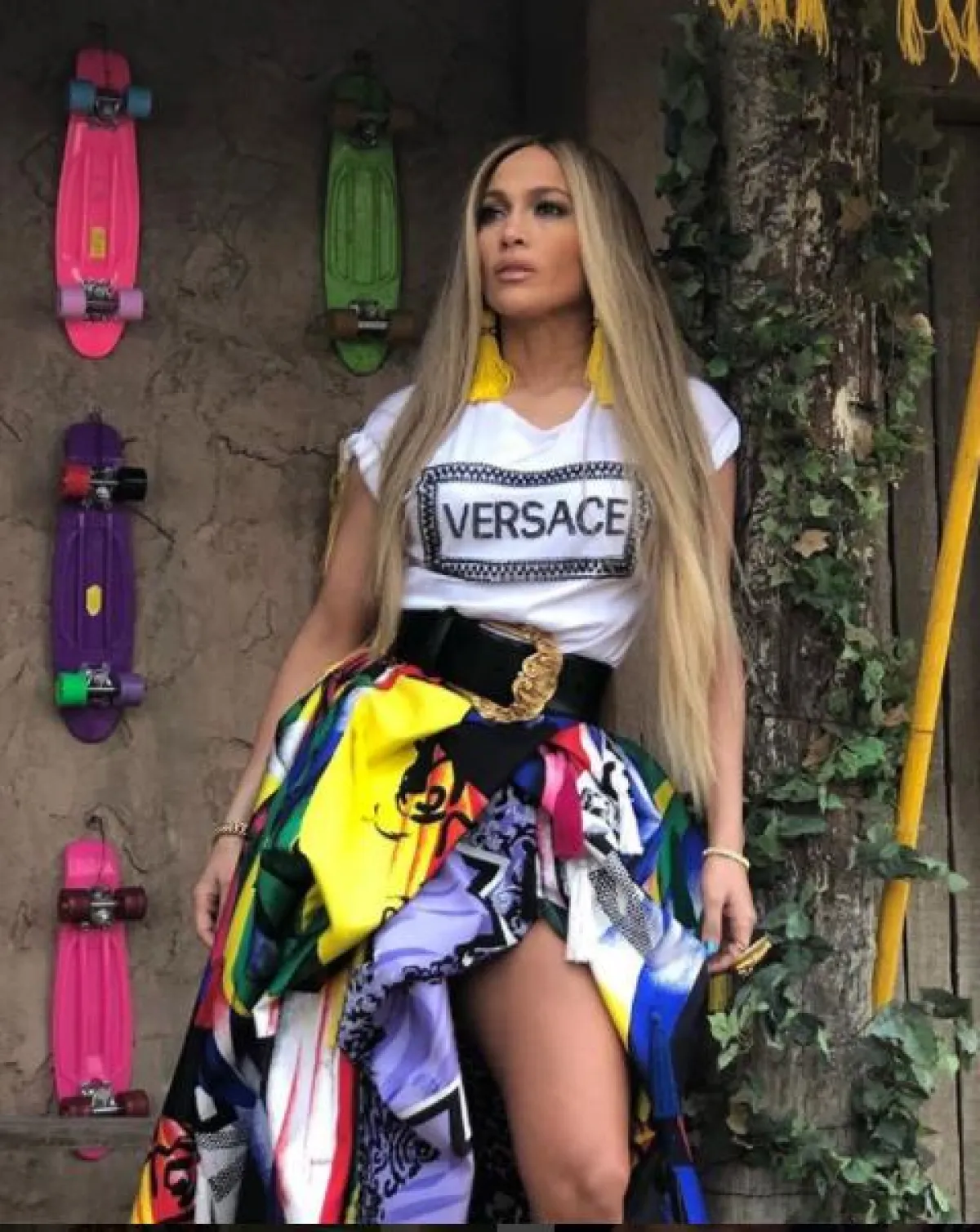 وقد تألقت النجمة، البالغة من العمر 48 عاماً، بإطلالة عصرية مميزة من فيرزتشي Versace ، حيث ارتدت كنزة باللون الأبيض مكتوباً عليها "فيرزتشي" Versace إضافة إلى تنورة ملونة فضفاضة.