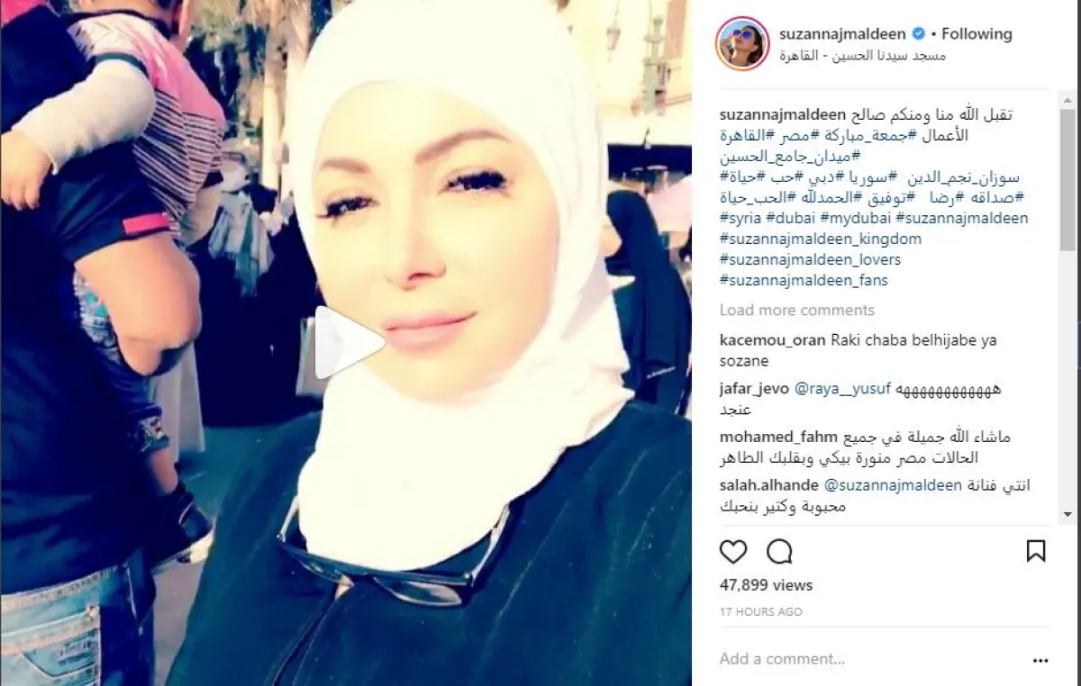أثارت الفنانة السورية سوزان نجم الدين، حالة من الجدل بين رواد حسابها على موقع إنستقرام بسبب نشرها مقطع فيديو لها أثناء وجودها بالحجاب في مسجد الإمام الحسين في القاهرة لصلاة الجمعة، وعلقت عليه قائلة: "تقبل الله منا ومنكم صالح الأعمال"، لتزداد التكهنات حول تفكير النجمة السورية في اعتزال الفن.