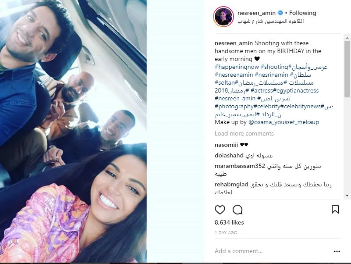 الممثلة المصرية نسرين أمين نشرت صورة من كواليس تصوير مسلسلها الجديد "عزمي وأشجان" برفقة النجم حسن الرداد، وعلقت عليها قائلة: "بصور مع الرجالة الوسيمة في عيد ميلادي"، ويبدو أن الرسالة لم تكن لجمهورها وإنما لفريق عمل المسلسل، فعلى الفور تم اعداد احتفال كبير لها داخل موقع التصوير، وتولى الرداد نشر وقائعه عبر حسابه بموقع إنستقرام.
