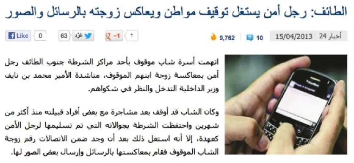 قصة جديدة من قصص خيانة الأمانة مسرح أحداثها هو مقر إحدى مراكز الشرطة السعودية، فقد استغل أحد رجال الأمن كما تردد توقيف مواطن شاب ليعاكس زوجته بالرسائل والصور من جواله وفقا لما نشر موقع الصحافة السعودية ، وعندما اكتشف الأمر قامت أسرة الشاب الموقوف بأحد مراكز الشرطة جنوب الطائف باتهام رجل أمن في المركز بمعاكسة زوجة ابنهم الموقوف، مناشدة وزير الداخلية التدخل والنظر في شكواهم.