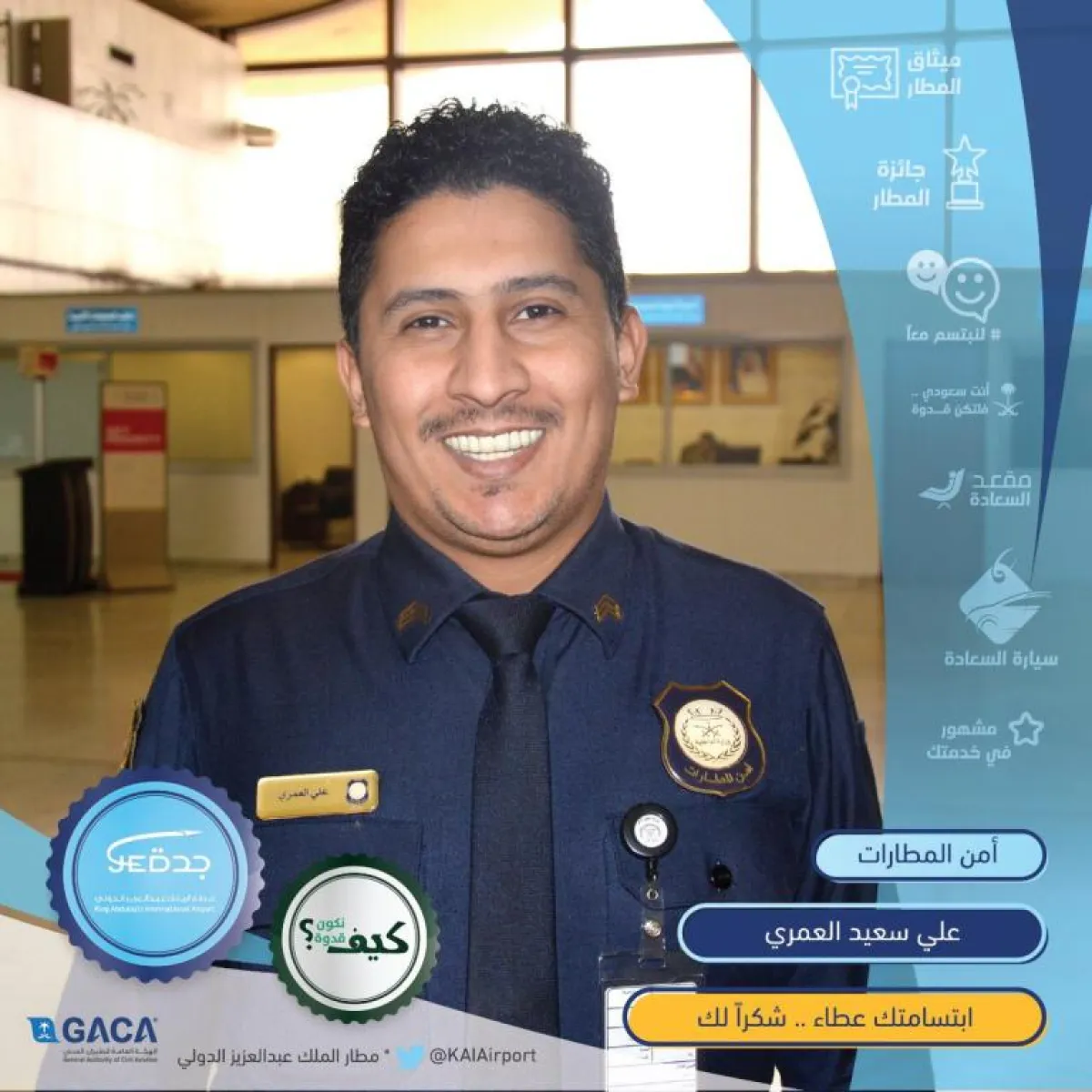 والمبادرات السبع هي: مبادرة "سيارة السعادة"، و"مشهور في خدمتك"، و"أنت سعودي فلتكن قدوة"، و"مقعد السعادة"، و"ميثاق المطار"، و"جائزة المطار"، ومبادرة "لنبتسم معاً"، التي تستهدف القطاعات الحكومية وشركات الطيران، إضافة إلى المسافرين.