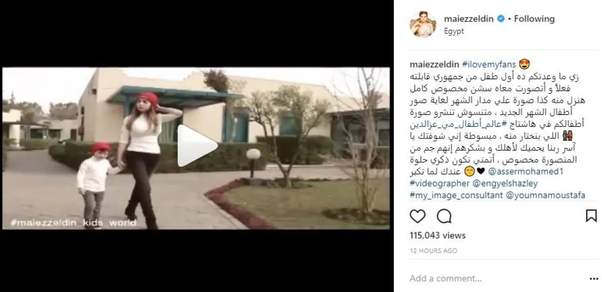 مي اختارت طفلاً يدعى آسر وظهرا معاً عبر حسابها الموثق بموقع إنستقرام، بإطلالة متشابهة وعلقت على الفيديو قائلة: زي ما وعدتكم ده أول طفل من جمهوري قابلته فعلاً و أتصورت معاه سشن مخصوص كامل هنزل منه كذا صورة علي مدار الشهر لغاية صور أطفال الشهر الجديد ، متنسوش تنشرو صورة أطفالكم في هاشتاج #عالم_أطفال_مي_عزالدين اللي بنختار منه .