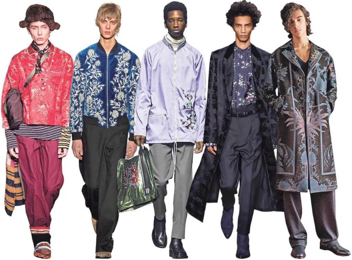 بدلات بقماش مطبّع وقصّات جريئة لشاب عصري من Marni و Dries Van Noten و Kenzo و Haider Ackermann و Etro