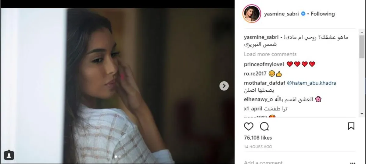 الفنانة ياسمين صبري شغلت الناس مجددًا بحياتها الخاصة، بعدما طرحت سؤالًا عن العشق مع صور رومانسية لها، وبدت في السؤال حائرة بين عشق المال وعشق الروح، وقالت مقتبسة أحد أبيات شعر للشاعر شمس التبريزي: ما هو عشقك؟ روحي أم مادي.