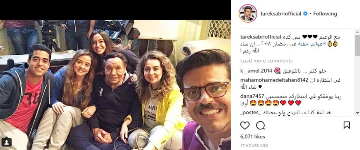 رغم انتشار شائعات تؤكد فرض الفنان عادل إمام طوقًا من السرية على كواليس تصوير مسلسله الجديد "عوالم خفية"، وتحذيره نجوم العمل من نشر أية صور من داخل الاستديو، إلا أنّ موقع انستقرام شهد بالأمس تسريبات عدة، الأولى أطلقها الفنان طارق صبري بعدما نشر صورة له من كواليس المسلسل ، حيث ظهر برفقة عادل إمام، كما ظهرت الفنانة إلهام عبد البديع في الصورة، وعدد من الفنانين الشباب، وعلّق صبري : مع الزعيم عوالم خفية في رمضان ٢٠١٨ ... إن شاء الله رقم ١ .
