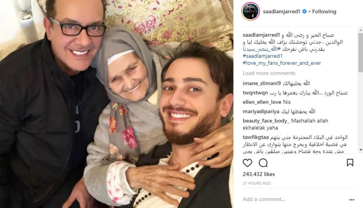 وجّه المطرب المغربي سعد المجرد رسالة مؤثّرة إلى جدّته، وذلك عبر حسابه الشخصي على موقع انستقرام، بعدما نشر صورة له برفقة جدته ووالده وعلّق عليها: صباح الخير.. ورضى الله والوالدين، جدتي توحشتك بزاف، الله يخليكِ ليّا ويقدّرني باش نفرّحك.