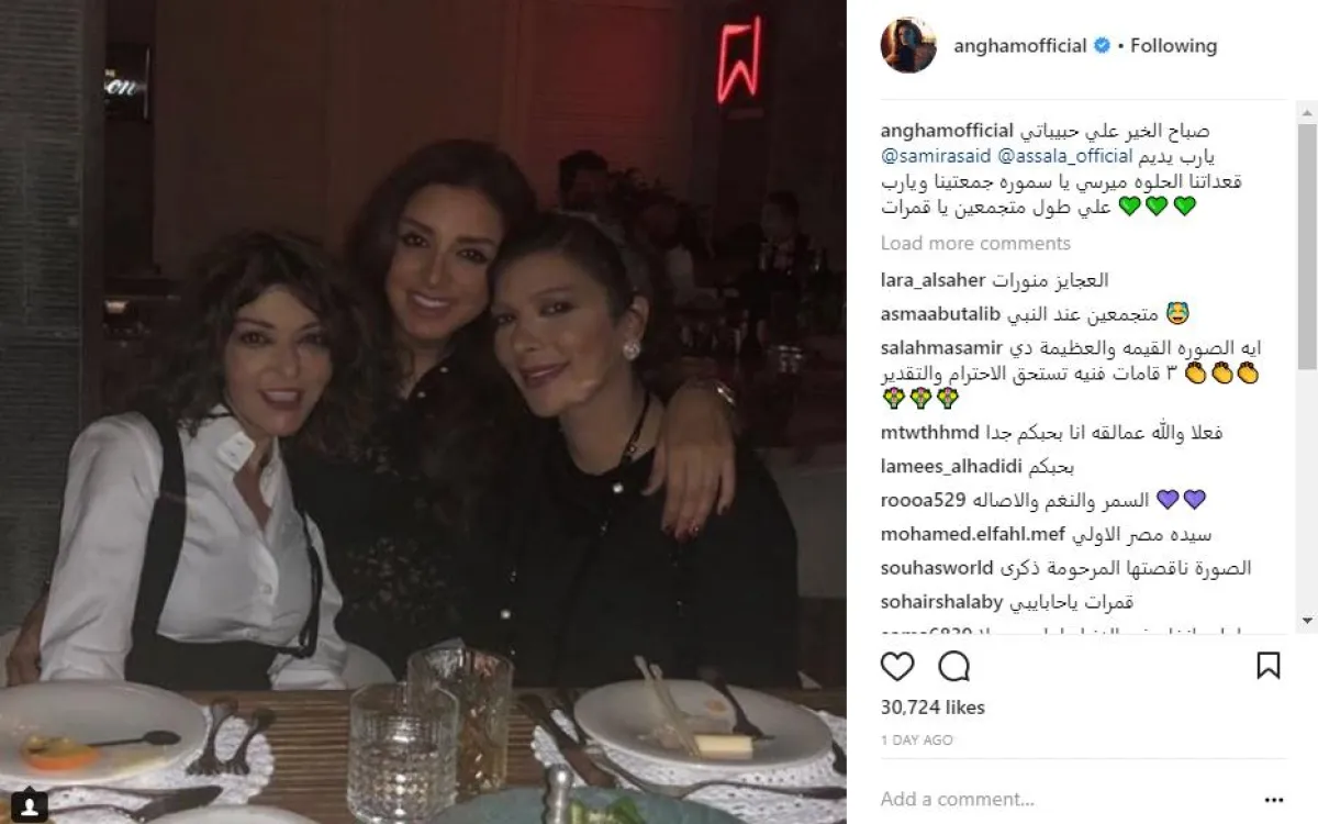 شاركت الفنانة أنغام جمهورها بنشر صورة جديدة تجمعها بكل من سميرة سعيد وأصالة عبر حسابها بموقع انستقرام، وعلقت على الصورة قائلة: صباح الخير على حبيباتي أصالة وسميرة سعيد، يارب يديم قعداتنا الحلوة، ميرسي يا سمورة جمعتينا ويارب على طول متجمّعين يا قمرات.