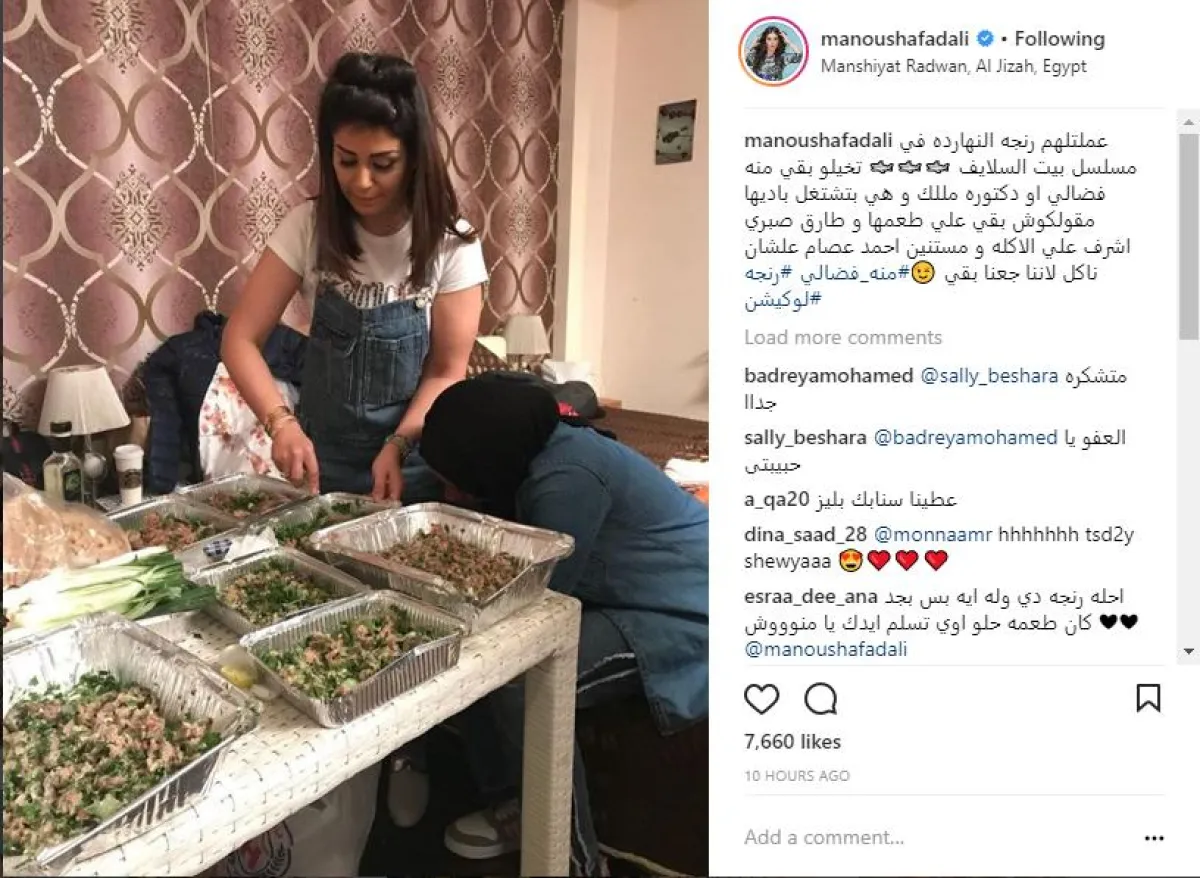 لفنانة منة فضالي حضرت في ستديو تصوير مسلسل "بيت السلايف" لأسباب غير فنية هذه المرة، فقد أعدّت وجبة هائلة من أطباق الرنجة، لفريق العمل بعد انتقالهم لمدينة السادس من أكتوبر، ونشرت منة عبر حسابها على موقع انستقرام مجموعة صور لها برفقة فريق عمل المسلسل، وعلّقت عليها قائلة : عملتلهم رنجة النهارده في مسلسل بيت السلايف، تخيّلوا بقى منة فضالي أو دكتورة ملك، وهيّ بتشتغل باديها مقولّكوش بقى على طعمها، وطارق صبري أشرف على الأكلة، ومستنيين أحمد عصام علشان ناكل، لإننا جعنا بقى #منة_فضالي #رنجة #لوكيشن