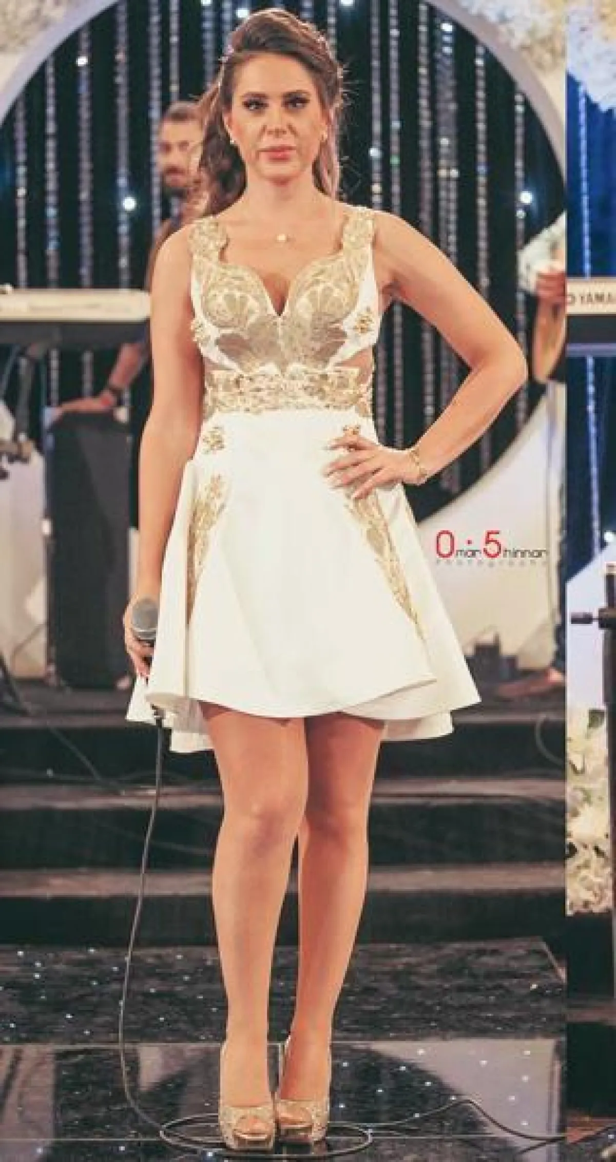 ديمة قندلفت في فستان قصير باللونين الأبيض والذهبي