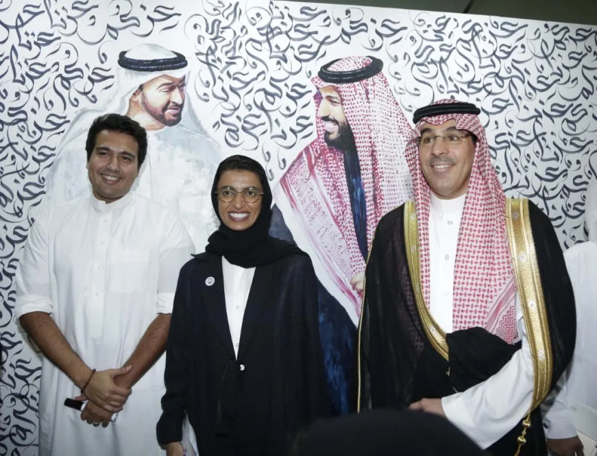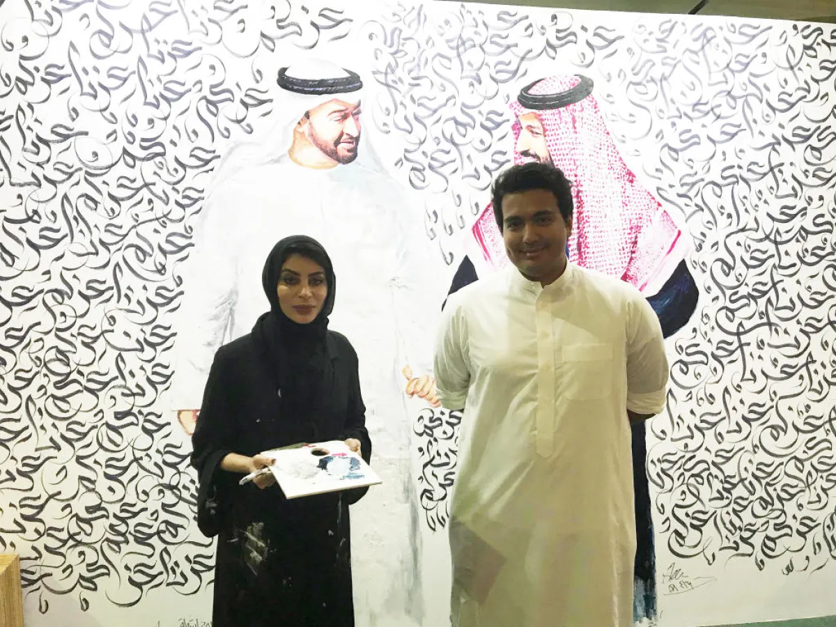 وعن اللوحة، قالت الفنانة التشكيلية الإماراتية أشواق عبدالله لـ"سيدتي": إن العمل الجداري الفني جاء مناصفة مع الخطاط السعودي شاكر كشغري، وأتت الفكرة عندما كنا نحاول التوصل إلى تنفيذ عمل فني، نتمكن من خلاله إبراز مدى قوة العلاقة بين البلدين الشقيقين، فجاء تنفيذ هذا العمل الفني بالرسم والخط العربي، واستغرق منا يومين قبل بدء المعرض، وركزنا في الجدارية على إبراز قادة الدولتين تجسيداً للوحدة الوطنية.