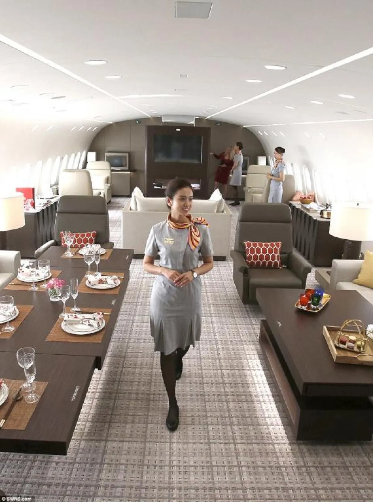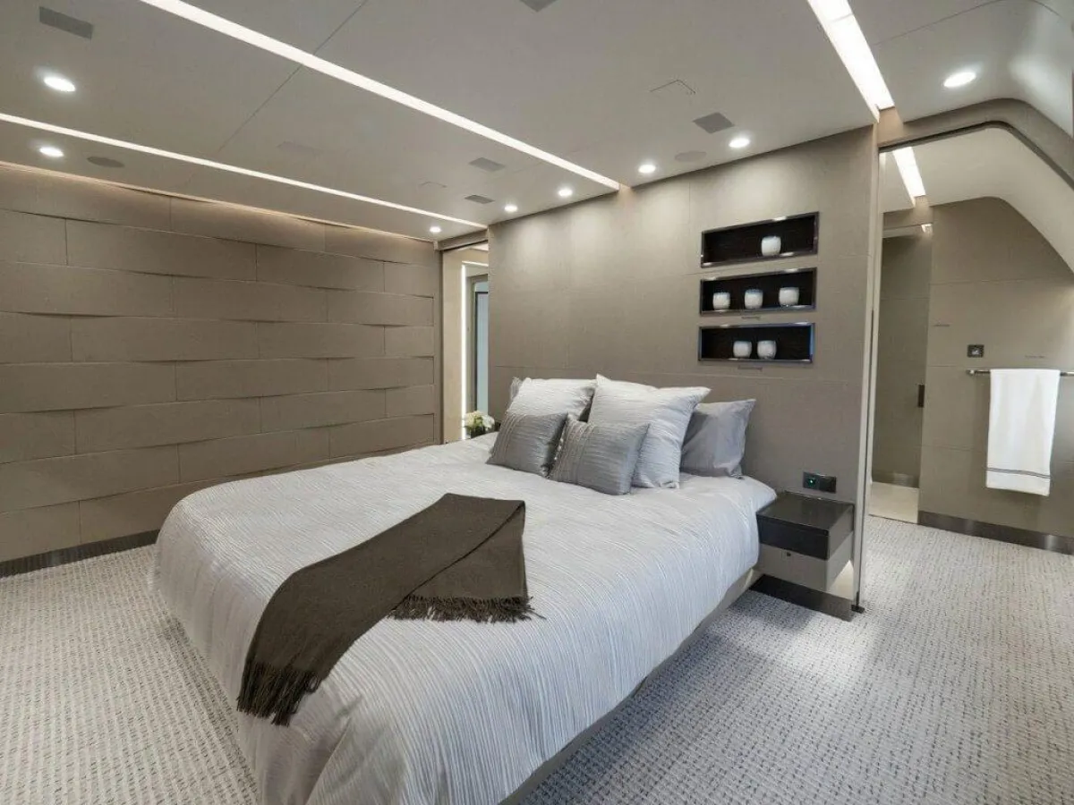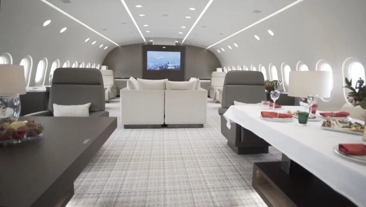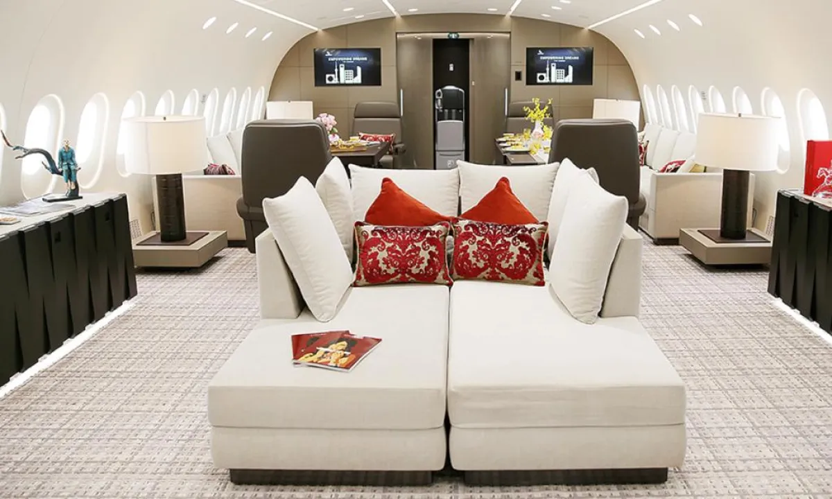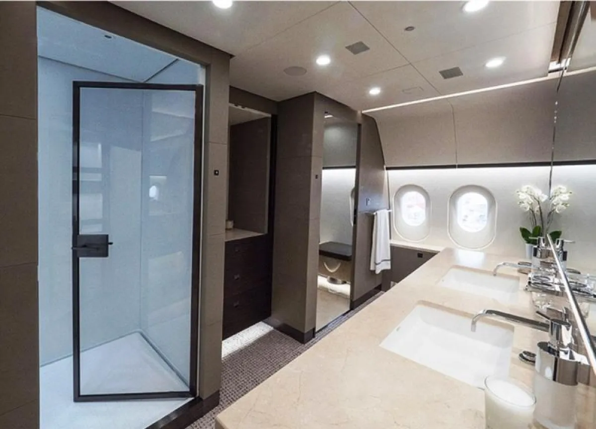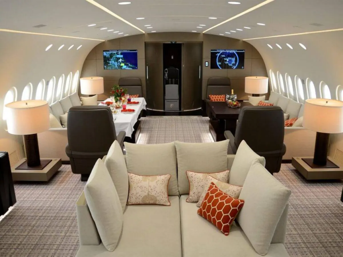 الطائرة مُزوَّدة بأرضيَّات مدفأة، وتضمُّ غرفة نوم رئيسة تحتوي على سرير مزدوج، بالإضافة إلى حمَّام كامل مع مساحة للـ"دش"، فضلًا عن خزانة للملابس مُزوَّدة بخزينة لحفظ المقتنيات الثمينة داخلها وصالة فسيحة مليئة بالأعمال الفنيَّة الممتعة وغرفة للطعام. وهي تُقدِّم مستوى خدمة راقيًا بما يوازي خدمات الضيافة من فئة الخمس نجوم، بالإضافة إلى تنقية الهواء والحدِّ من الضوضاء. علمًا بأنَّ الشركة الاستشارية (كيستريل للطيران) والمصمِّم الفرنسي جاك بييرجيان قضيا أكثر من عامين في تصميم الطائرة من الداخل. وهذه الأخيرة مُزوَّدة بمقاعد خاصَّة بالشخصيَّات الهامَّة، على مساحة إجماليَّة وقدرها 213 مترًا مربعًا، وهو ما يُوفِّر الراحة في التنقل والجلوس في أماكن مختلفة بالطائرة، فالمساحة تكفي لـ220 مقعدًا للركاب إذا كانت الطائرة في حالتها التقليدية.