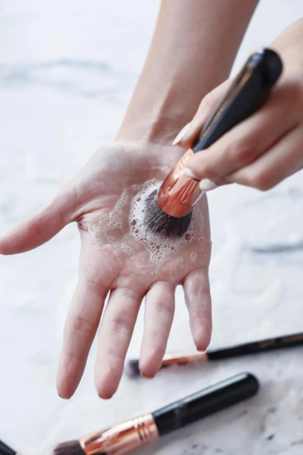 تحتاج فرش المكياج إلى الغسل أسبوعيًّا. وذلك للحفاظ عليها نظيفة وخالية من الجراثيم. إضافة إلى أنّ الغسل يساهم في إزالة المنتجات المتراكمة، ما يسهّل عملية تطبيق المكياج. أما عن طريقة غسل الفرش، فاستخدمي الصابون المخصص لتنظيف فراشي المكياج، وتأكدي من خلوّه من المواد الكيميائية. دلّكي الصابون جيدًا وتحديدًا عند شعر الفرشاة ذهابًا وإيابًا، حتى إزالة رواسب المنتجات المتراكمة. بعدها اغسلي الفرشاة جيدًا بالماء.