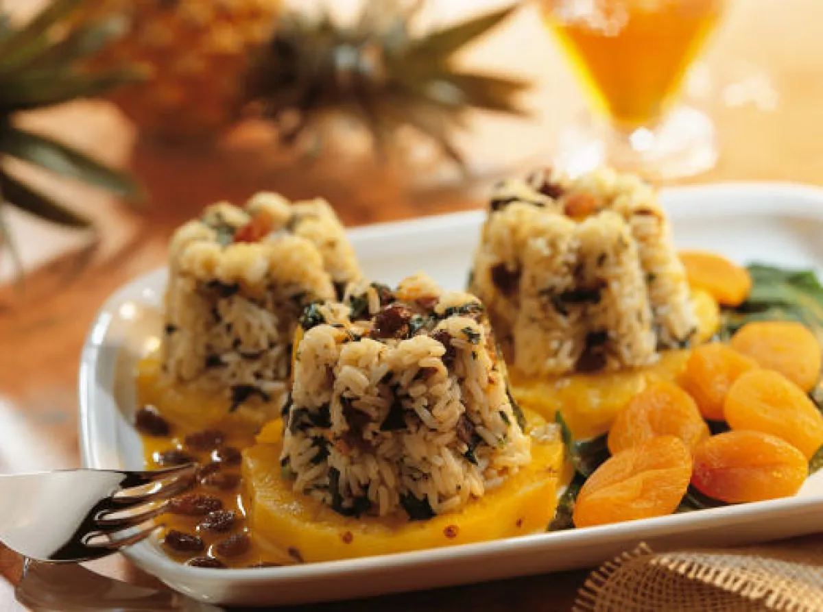 3- يقلّب الأرز ويوضع على نار هادئة لمدة 10 دقائق، ثم يرشّ الزعفران على الوجه، ليوزّع بعدها المشمش والتين والأناناس فوق الأرز، مع التقليب.