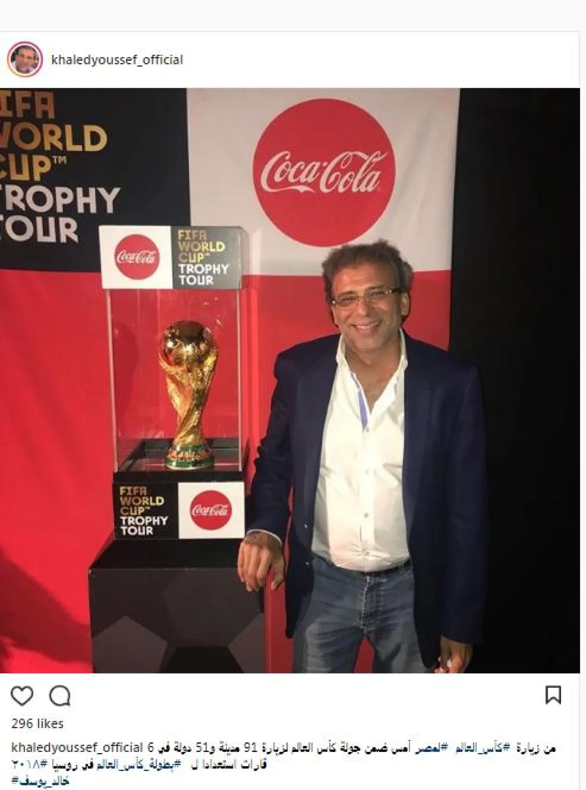 نشر المخرج خالد يوسف صورة له عبر حسابه بموقع إنستقرام برفقة كأس العالم المصنوعة من الذهب الخالص، بمطار القاهرة، والذي جاء على متن طائرة خاصة، بحضور وفد من الاتحاد الدولي لكرة القدم.
