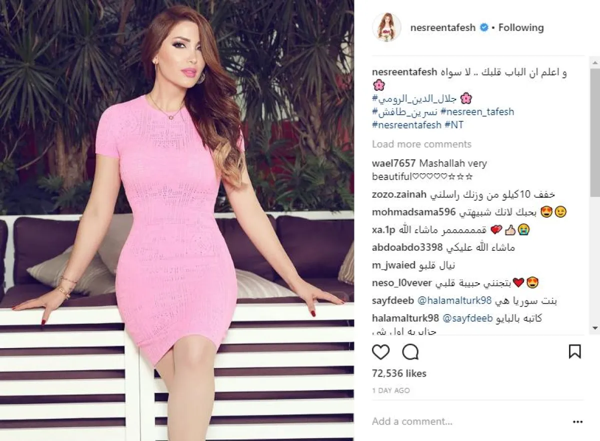 الفنانة السورية نسرين طافش نشرت صورة جديدة لها، وكالعادة استعارت التعليق عليها من قصائد الشاعر الراحل جلال الدين الرومي، حيث كتبت: و اعلم ان الباب قلبك .. لا سواه!!