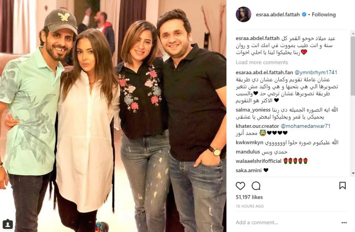 إسراء عبد الفتاح، نجمة مسرح مصر وزوجة الفنان حمدي الميرغني، نشرت عبر حسابها بموقع إنستقرام صورة تجمعها بمصطفى خاطر وزوجته من حفل عيد ميلاده، وعلقت عليها بطريقتها المثيرة قائلة: عيد ميلاد خوخو القمر كل سنة و انت طيب بمووت في امك انت وروان ربنا يخليكوا لينا يا احلى اخوات.