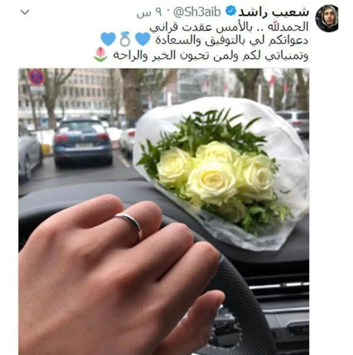 عقد الإعلامي الكويتي شعيب راشد قرانه بسريّة تامّة، وفاجىء متابعيه على "السوشيال ميدبا" بنشر صورة تظهر يد مزينة بخاتم زواج وعلق عليها" الحمد لله بالامس عقدت قراني. دعواتكم لي بالوفيق والسعادة وتمنياتي لكم ولمن تحبون الخير والراحة".