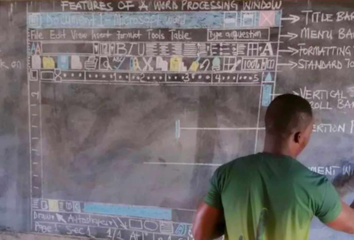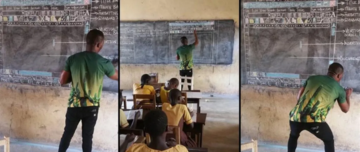 قبل عدة أسابيع، انتشرت صور معلم في إحدى مدارس قرية نائية ومنعزلة في دولة "غانا" غربي القارة الأفريقية، وهو يقوم بتدريس طلابه برنامج الـ"وورد word" من مادة الحاسوب، بدون وجود أي أجهزة، ذلك عبر رسم جميع تفاصيل هذا البرنامج الشهير على "سبورة" الفصل الدراسي، مستخدماً الطباشير الملونة فقط لإنجاز هذه المهمة، وسبب قيامه بهذا الأمر عدم وجود القدرات المالية المطلوبة لتأمين الأجهزة اللازمة في الفصول الدراسية.