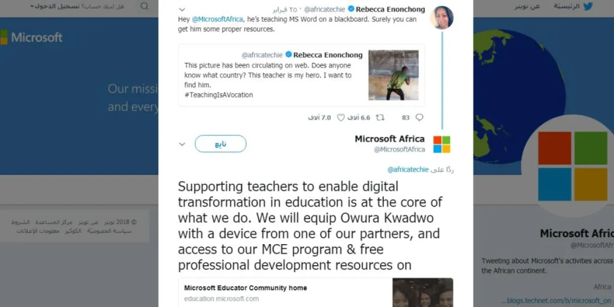 وجاء الخبر الجيد والمُدهش في الوقت نفسه، من نفس شركة "مايكروسوفت Microsoft"، التي قامت فور علمها بالقصة، بنشر تغريدة لها على صفحتها الرسمية على موقع تويتر، ترد فيها على تغريدة "إينونشونغ"، وتعلن تزويد المدرسة التي يعمل بها "أوورا كوادوو" بكافة الأجهزة اللازمة، بهدف دعم المعلمين في تمكين التحول الرقمي في العملية التعليمية، مؤكدةً على أنّ هذا العمل هو جوهر ما تقوم به.