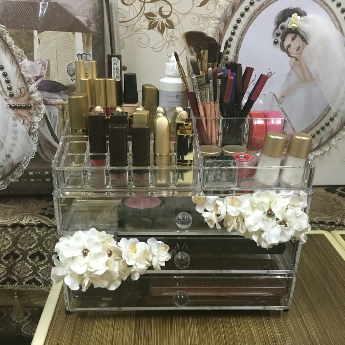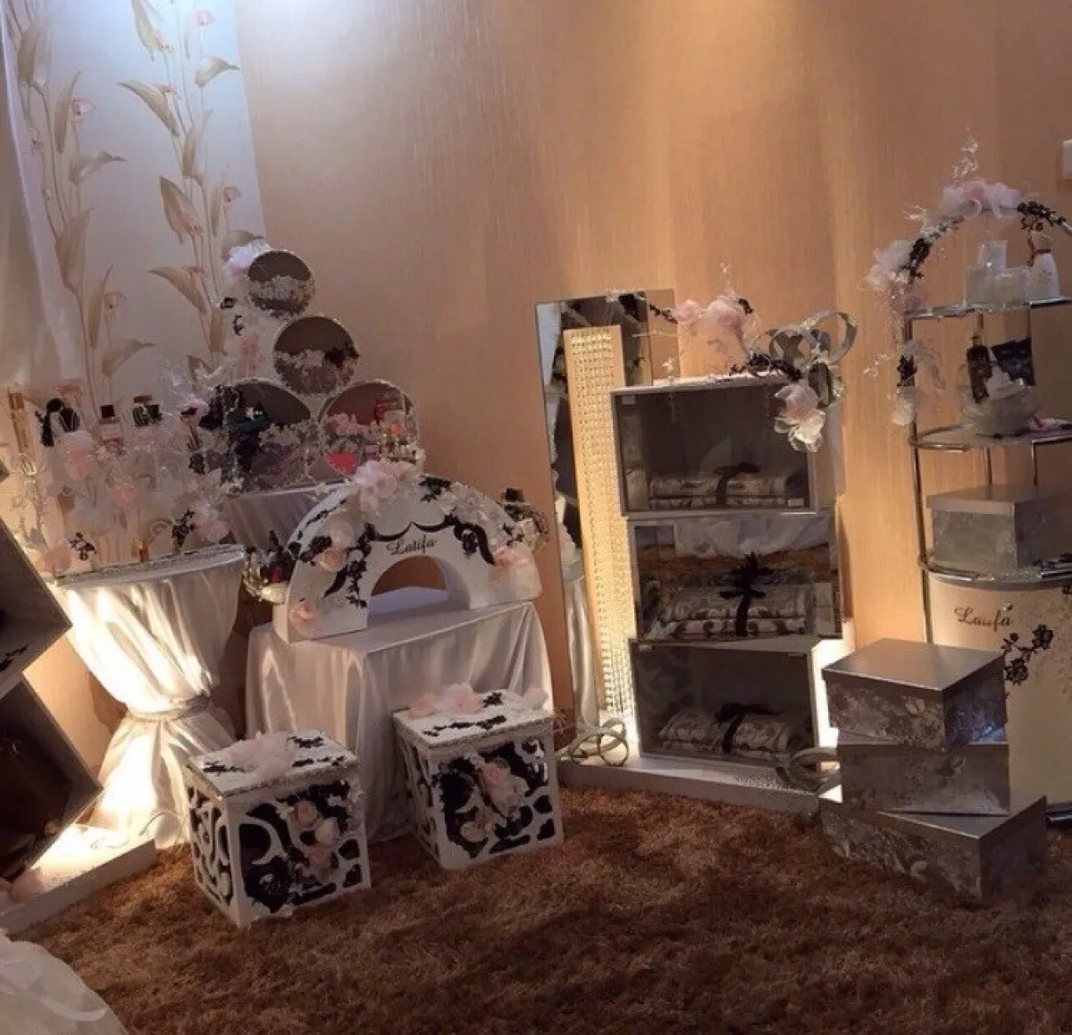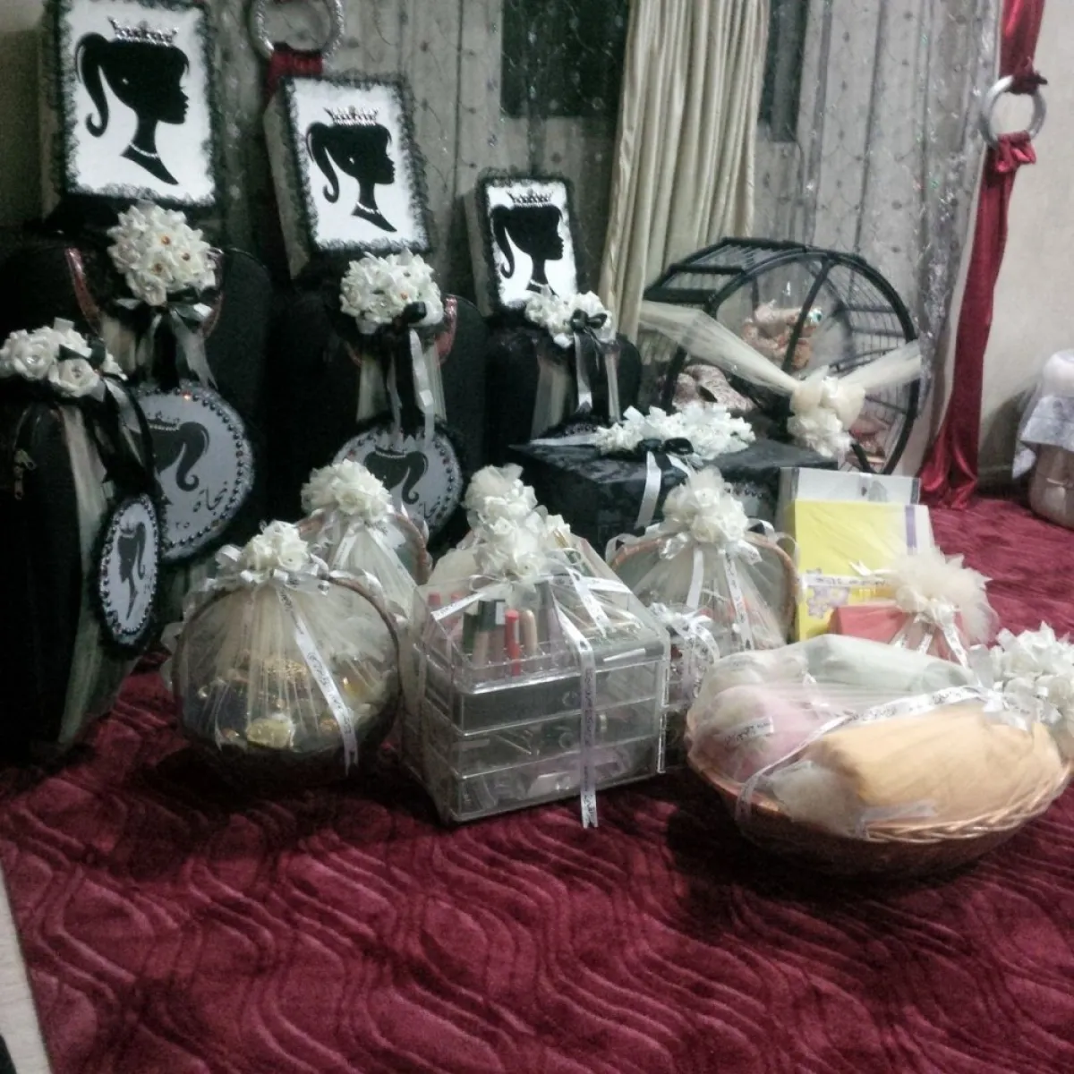 ـ الميك أب: احضار مستلزمات الماكياج من فرش وأرواج، وكل ما يخص الماكياج من شدو وظلال ومناكير وقطن ووضعها في حقيبة الماكياج أو إستاند للماكياج بشكل جذَّاب للتزيين.