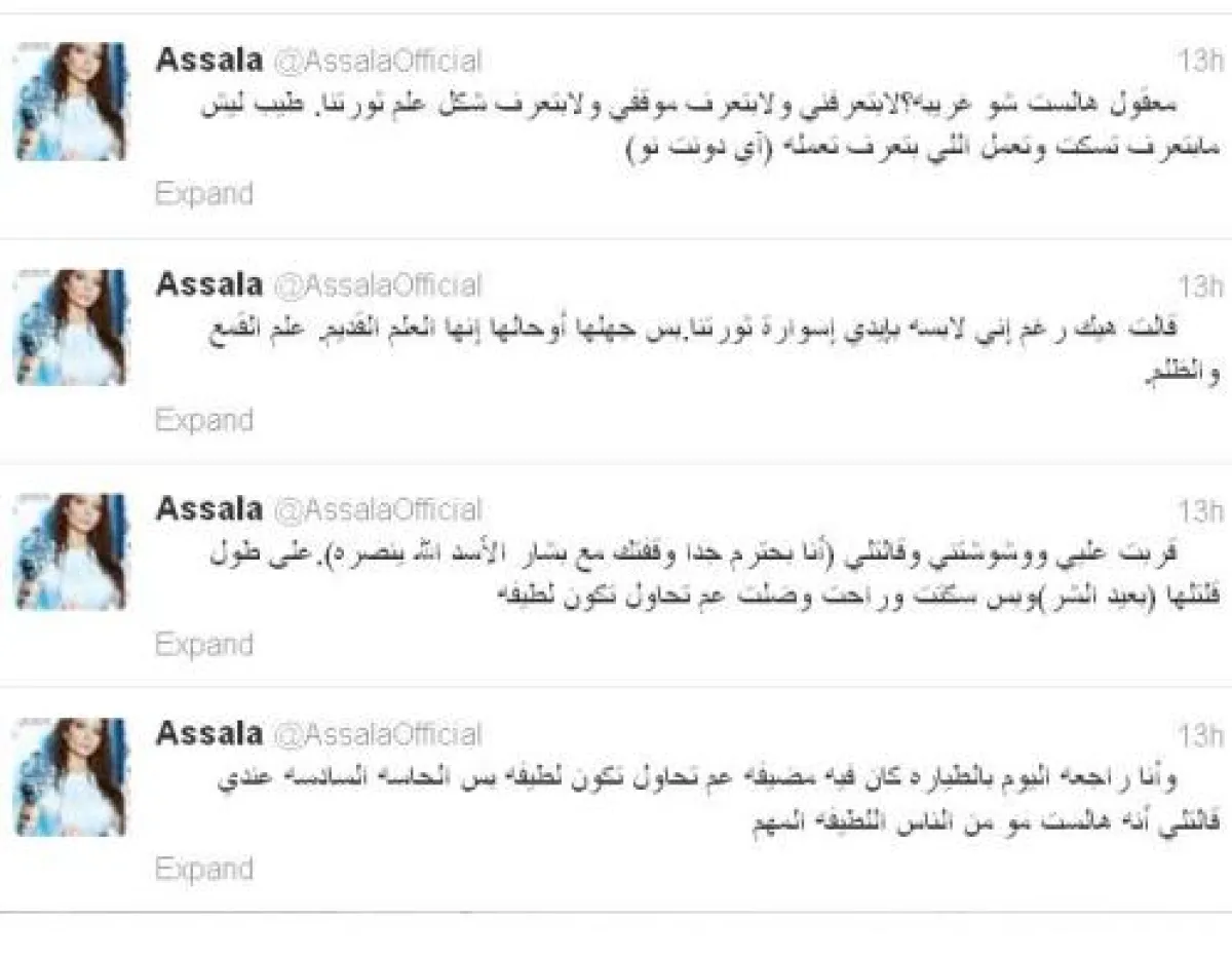 على الرغم من تشكيك البعض بموقف أصالة المستجد من الثورة السورية، وتأكيدهم بأنها غيرت موقفها السياسي بعد المجازر التي ارتكبت في بلدها سوريا من قبل النظام والمعارضة، كتبت أصالة رواية على صفحتها الخاصة على موقع "تويتر"، نفت فيها بشكل غير مباشر ما كتب حول تبدّل مواقفها السياسية، فغرّدت قائلة "وأنا راجعة اليوم بالطيارة، كان فيه مضيفة عم تحاول تكون لطيفة، بس الحاسة السادسة عندي قالتلي أنه هالست مو من الناس اللطيفة، المهم قرّبت عليي ووشوشتني وقالتلي (أنا بحترم جداً وقفتك مع بشار الأسد الله ينصره).على طول قلتلها (بعيد الشر)، وبس سكتت وراحت وضلت عم تحاول تكون لطيفة، قالت هيك رغم إني لابسة بإيدي إسوارة ثورتنا. بس جهلها أوحالها إنها العلم القديم. علم القمع والظلم."