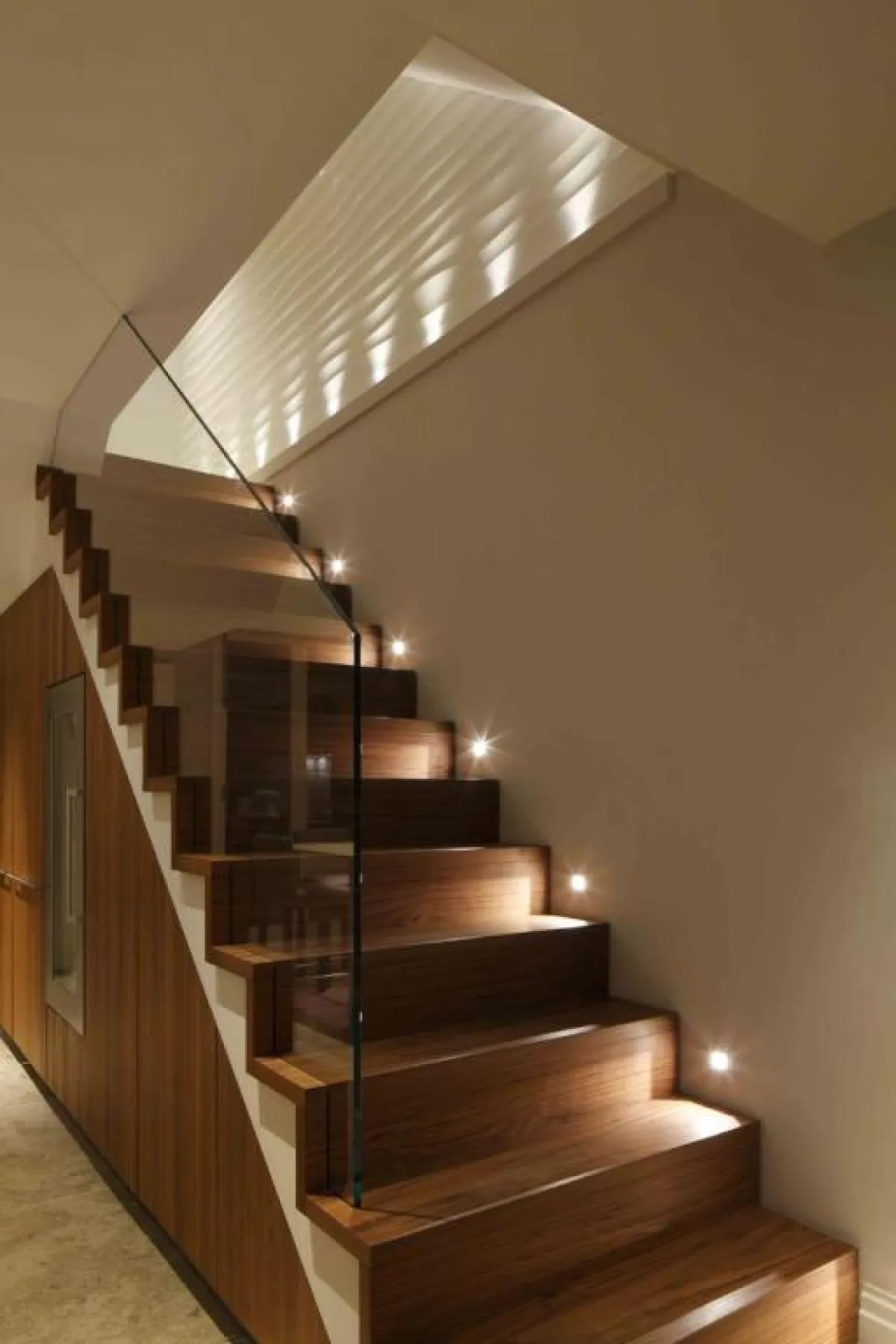 4. السلم والممرَّات: يُمكن وضع إنارة إرشاديَّة على السلالم، ما يُساعد قاطني المنزل في الليل، وذلك عندما تكون الإنارة العامَّة مغلقة. أمَّا الممرَّات فتُنار بإنارة جداريَّة، مع الحرص على توجيه أخرى مُركَّزة على العناصر الهامَّة فيها.